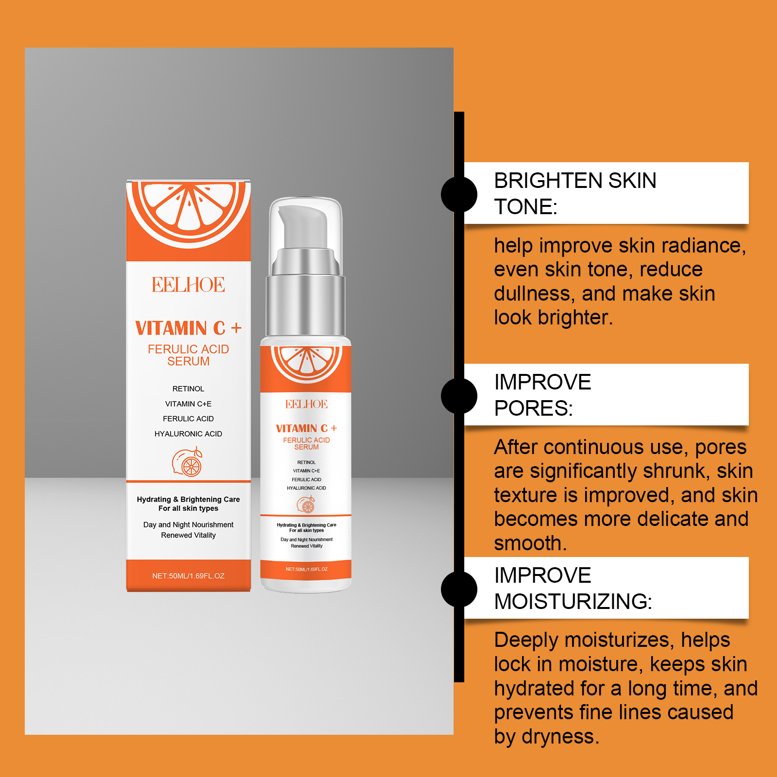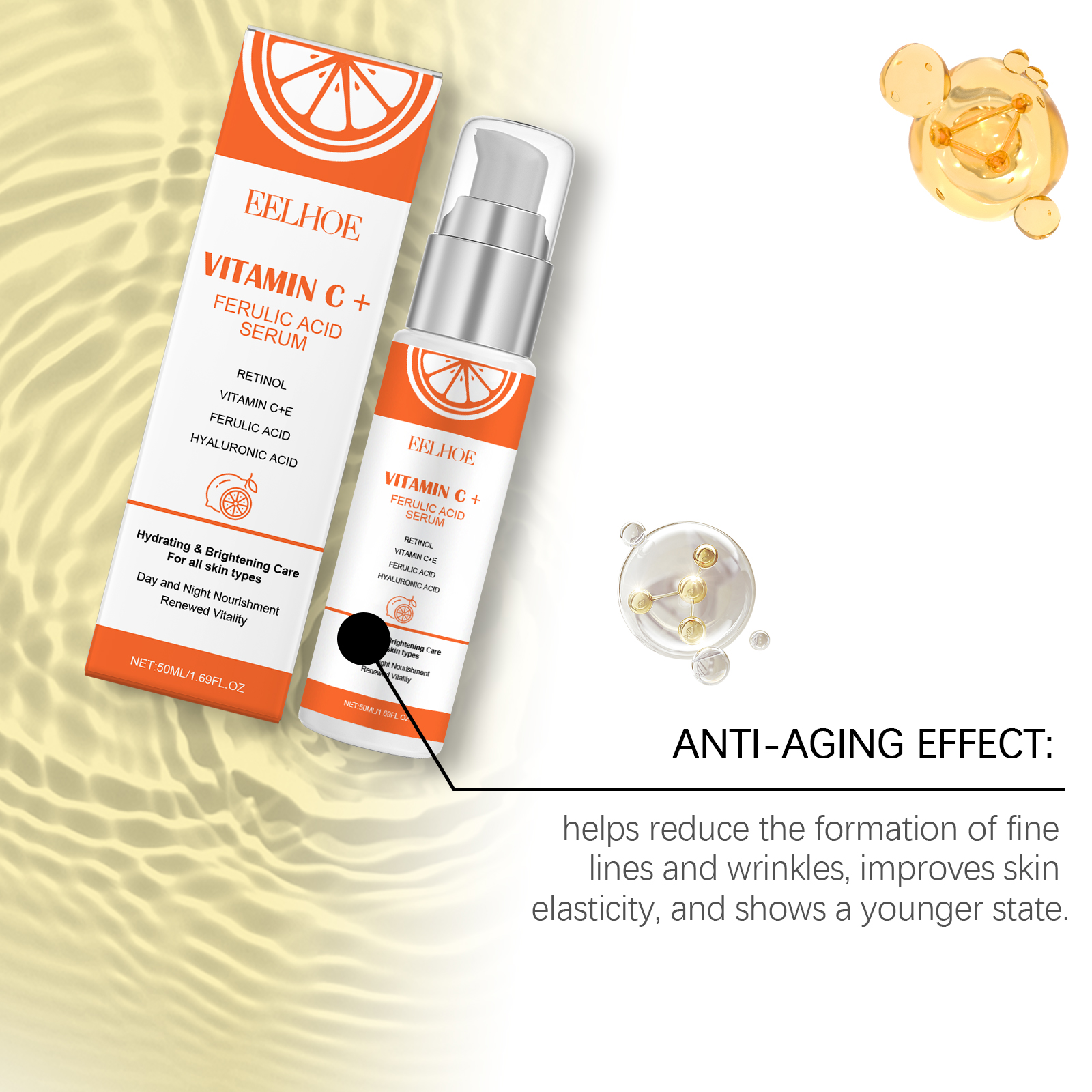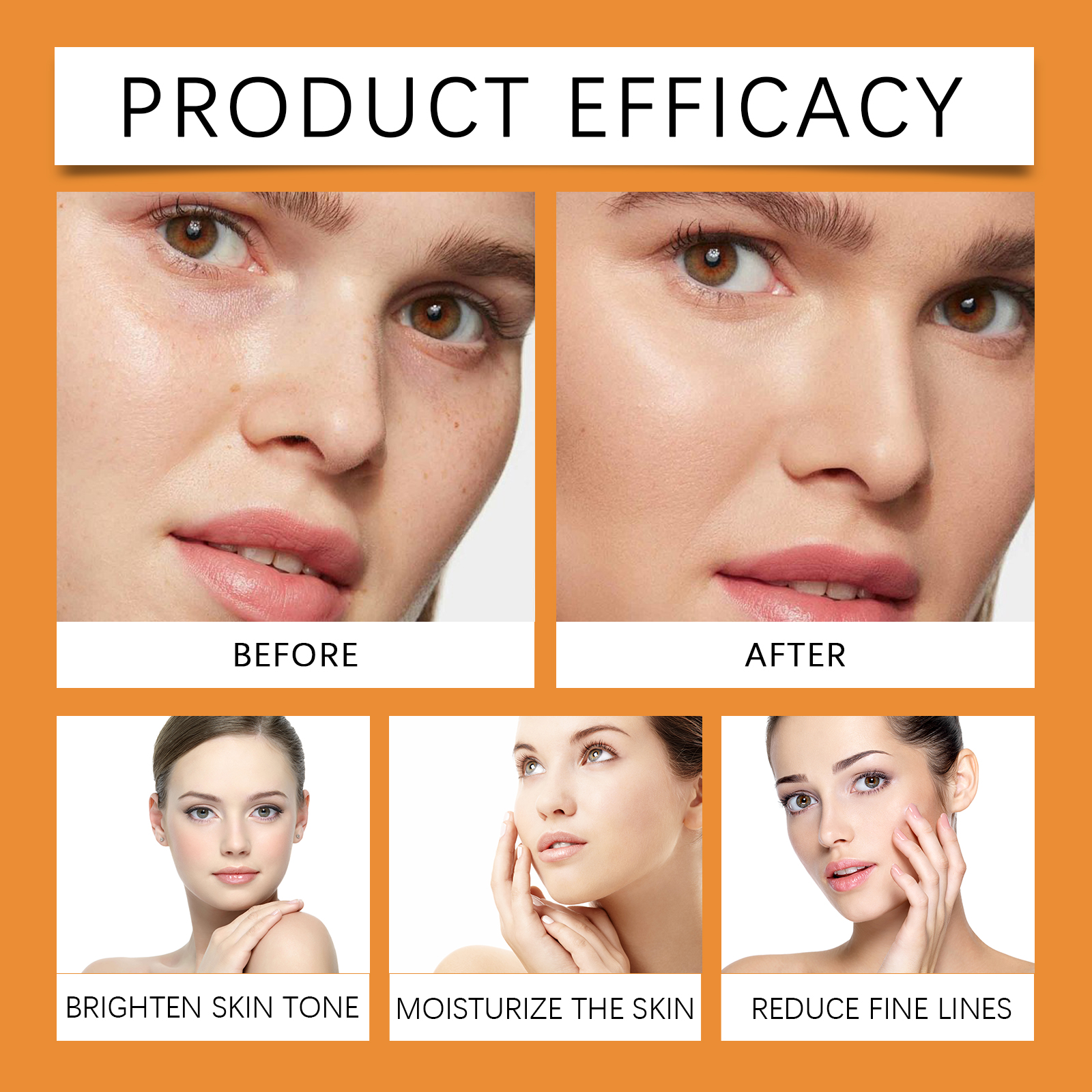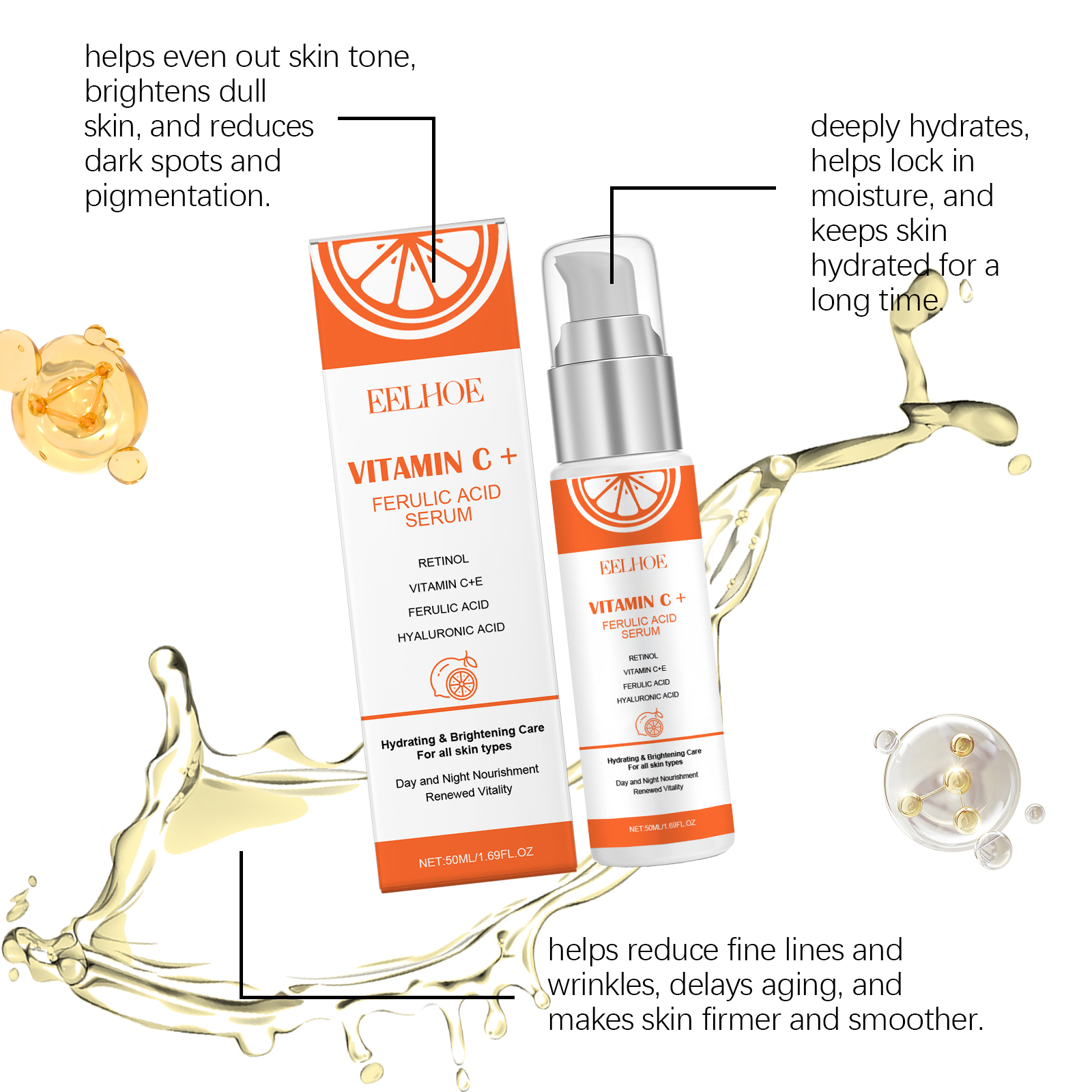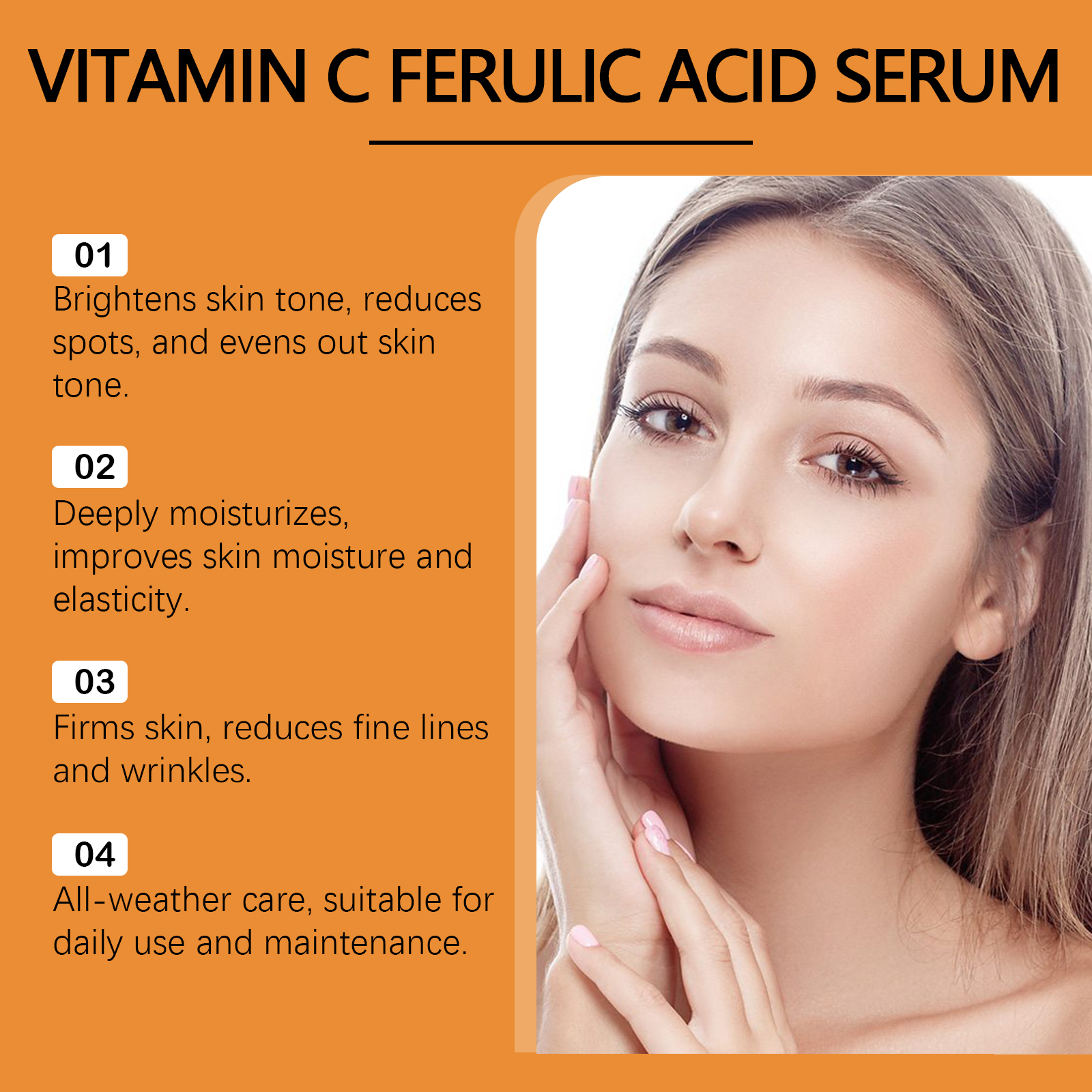 Our Vitamin C face serum contains retinol, tocopherol (vitamin E). It can help even out skin tone, reduce pigmentation issues, and show smoother and more delicate skin texture. Light texture, easy to absorb, suitable for daily use, will not produce greasy or cumbersome feeling. Its application is simple: gently massage it for 3-5 minutes until it is completely absorbed by the skin. Clean your face. Apply appropriate amount to face evenly. And can be fully nourishing, help repair skin damage, maintain healthy skin state. Easy to use, suitable for daily care anytime, anywhere, to help maintain optimal skin condition.