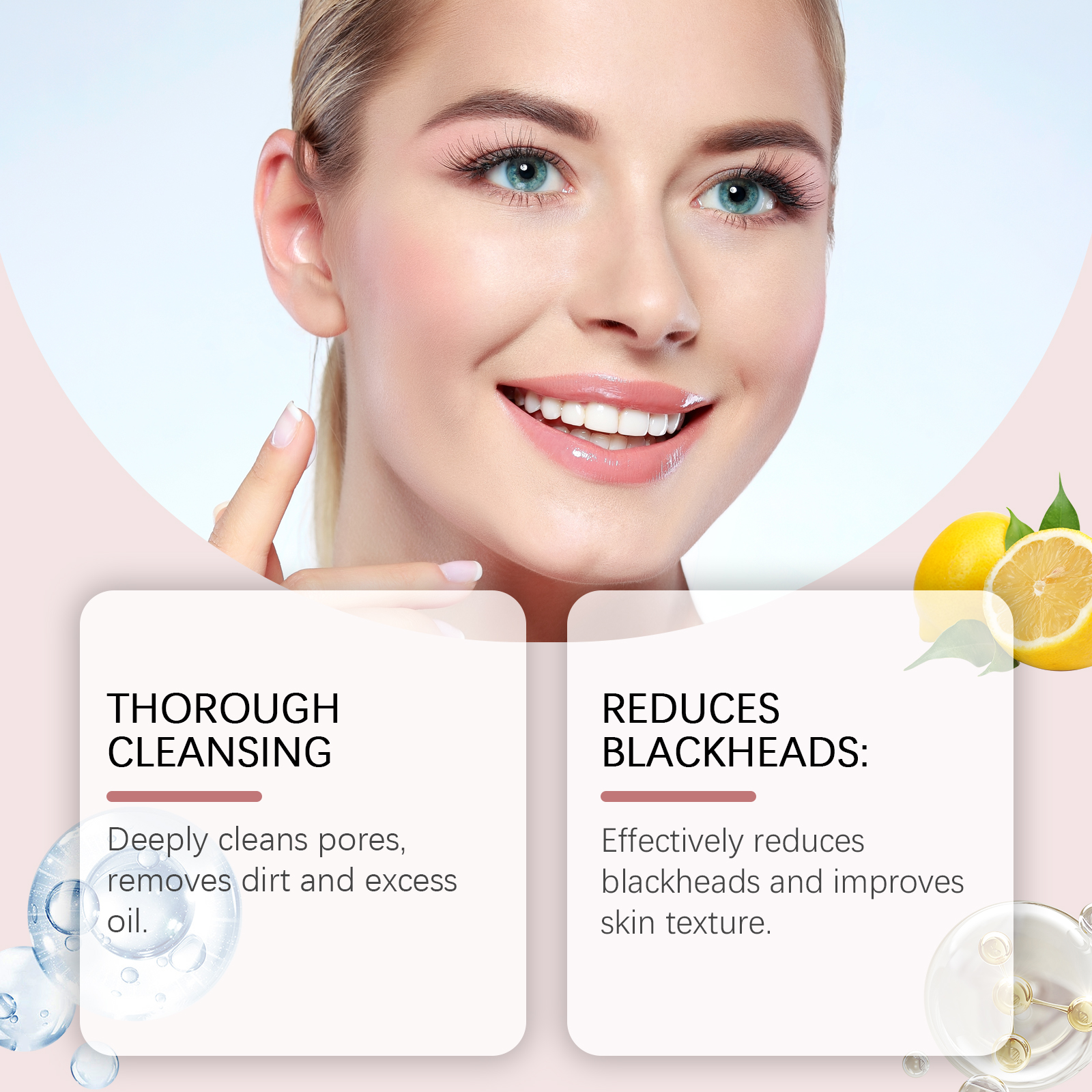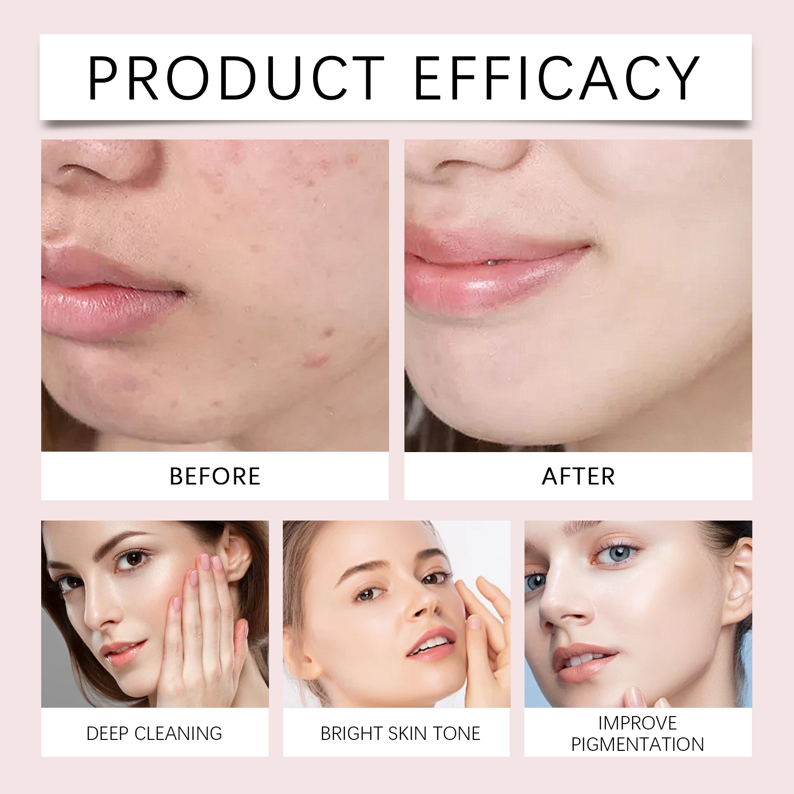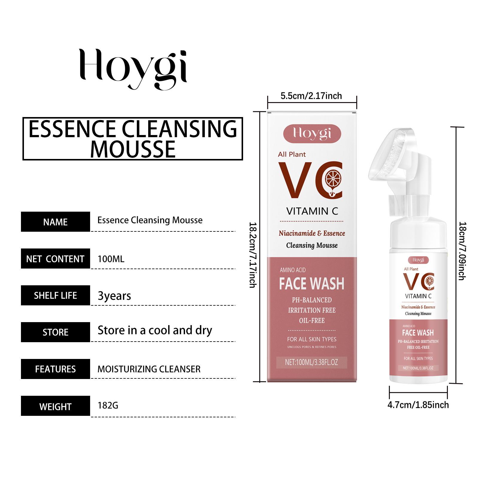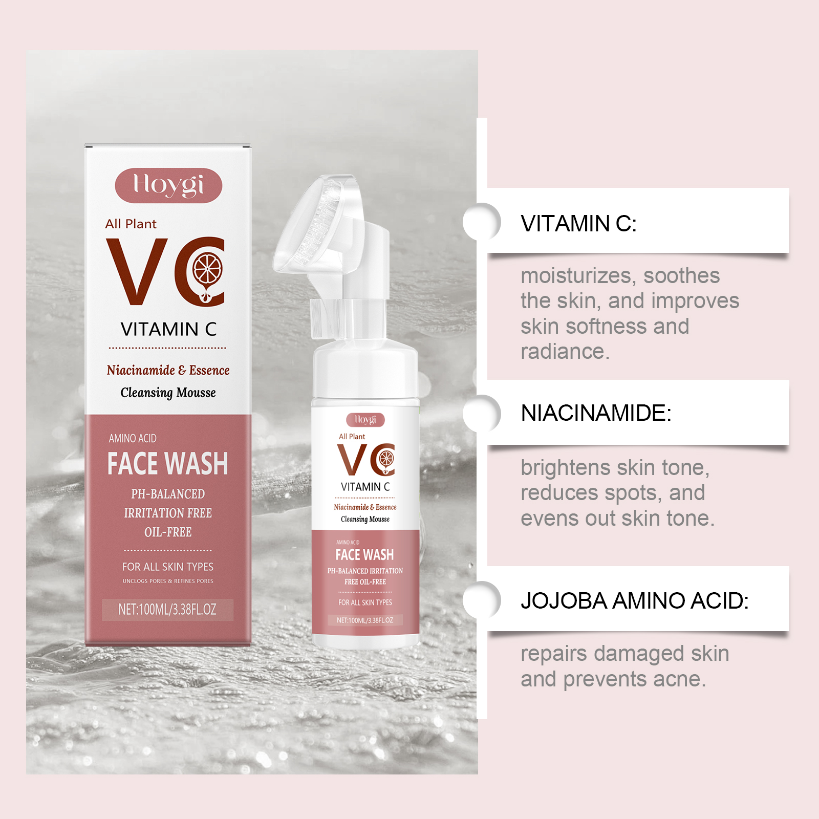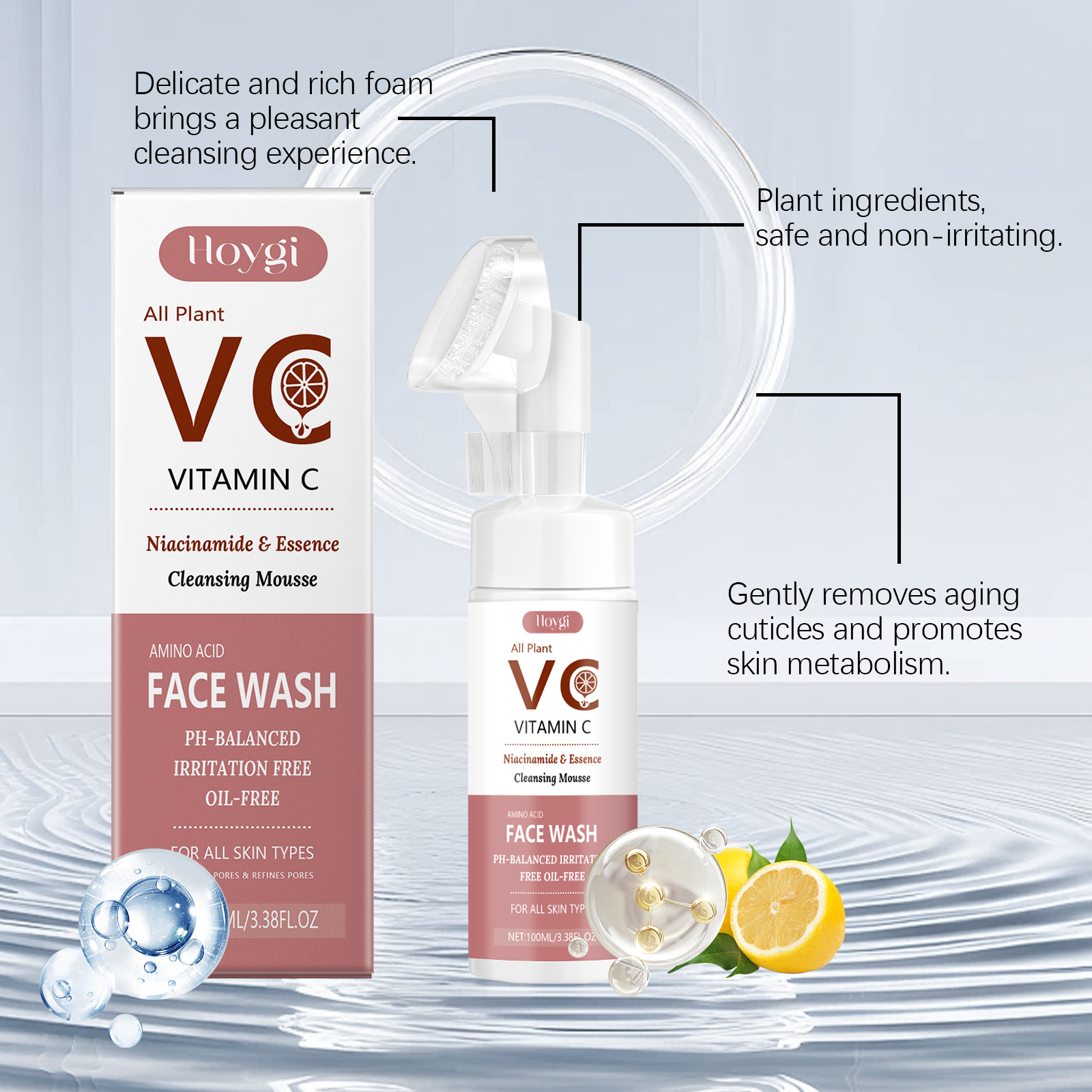 Our Vitamin C foaming cleanser contains ascorbic acid (vitamin C) and niacinamide. It deeply cleans pores and removes dirt and excess oil. Effectively reduce blackheads and improve skin texture. Its application method is very simple: first moisturize the facial skin, extrude the cleansing foam from the bottle, gently massage, and clean the face with the brush head. Finally, rinse thoroughly with warm water. It also fights bacteria and inflammation, preventing acne.