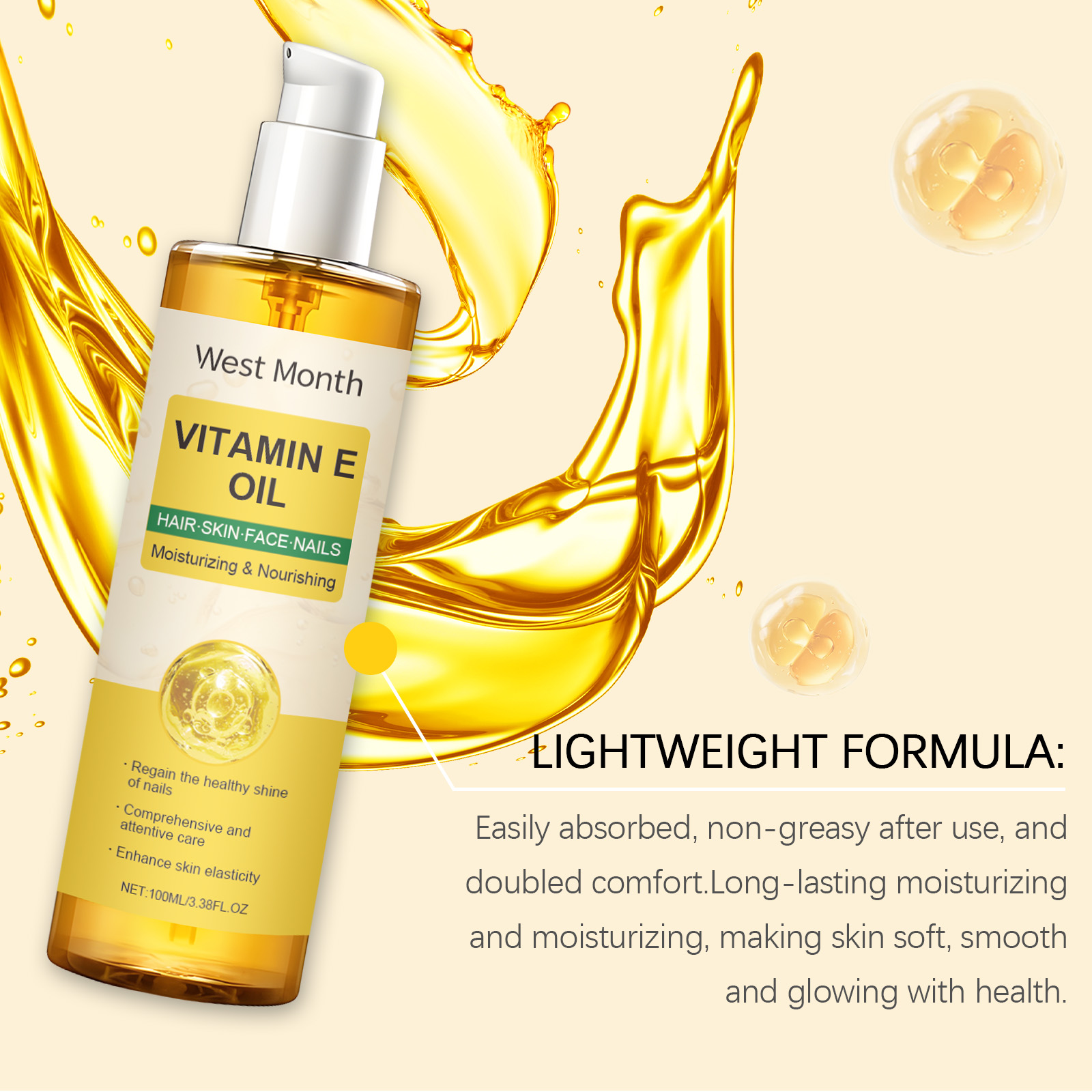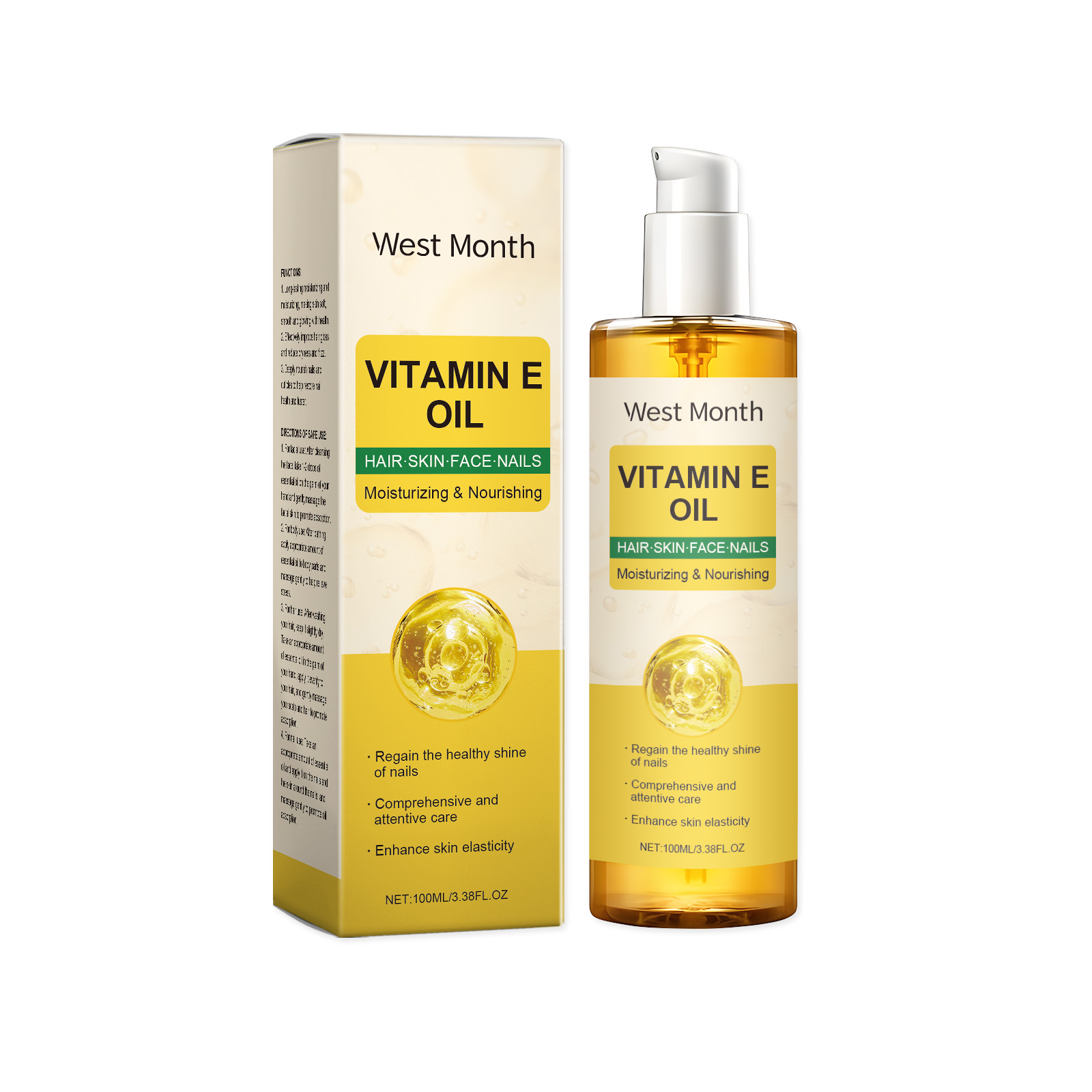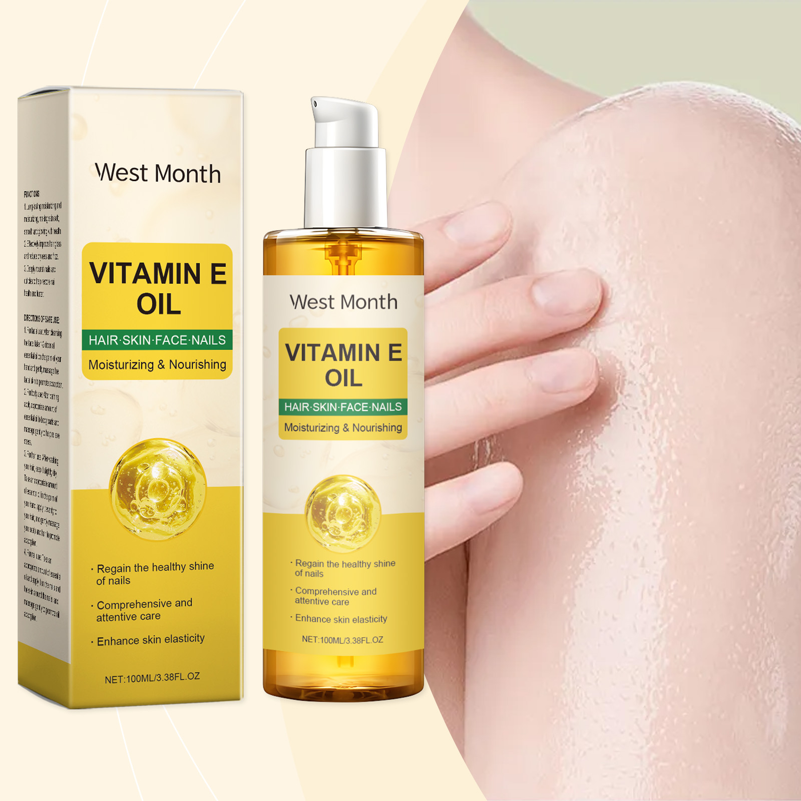 Our Vitamin E body oil contains sodium hyaluronate, lemon extract. It deeply nourishes the skin and retains moisture. Its use is very simple: for facial use: After cleansing, take 1-2 drops of essential oil on the palm of your hand and gently massage the facial skin to promote absorption. For body use: After bathing, apply an appropriate amount of essential oil to the body and massage gently to help relieve pressure for hair: After washing your hair, keep your hair slightly dry. Take appropriate amount of essential oil from the palm, evenly apply to the hair, gently massage the scalp and hair to promote absorption. For nail use: Apply appropriate amount of essential oil to the nails and the skin around the nails, and gently massage to promote oil absorption. It also keeps skin hydrated and soft.