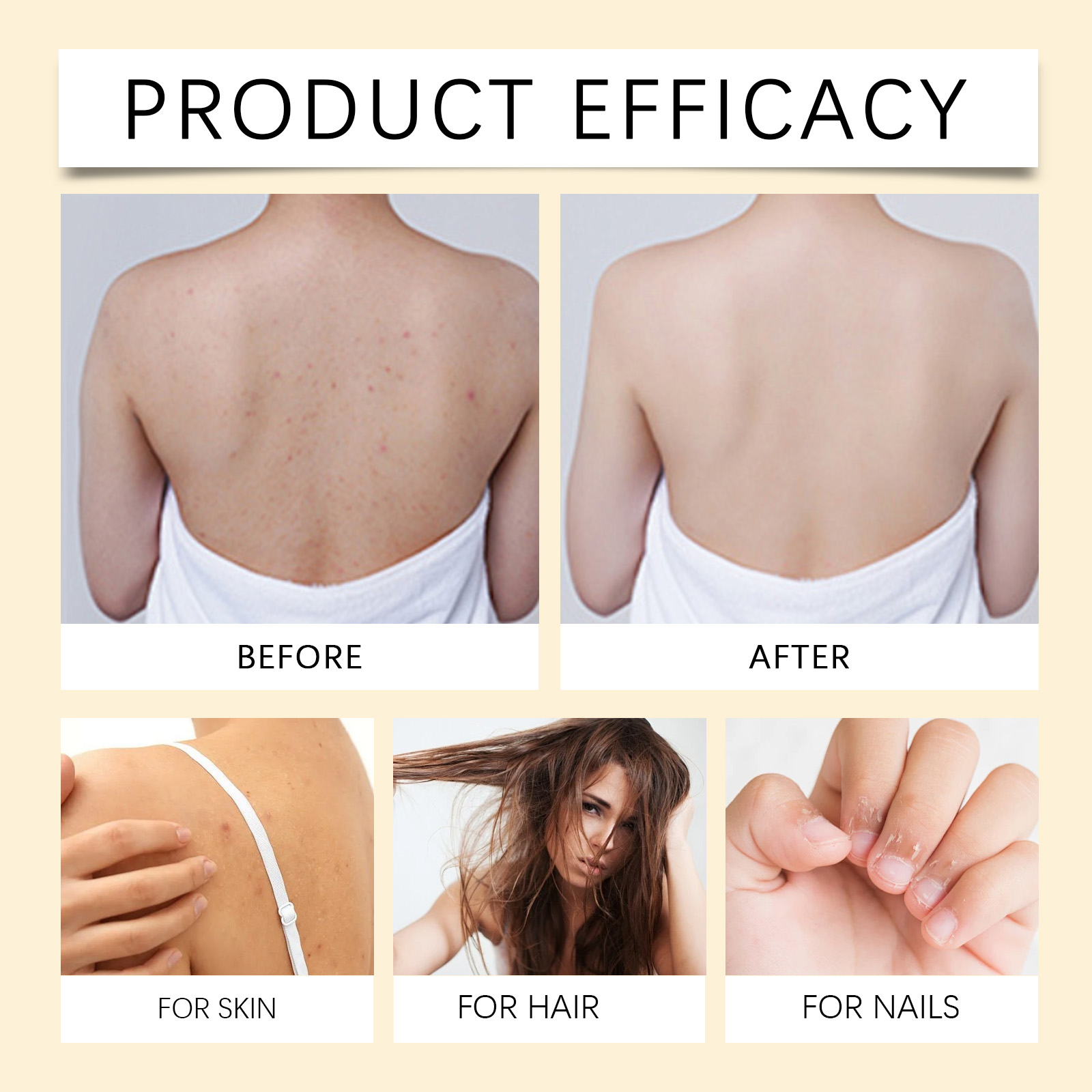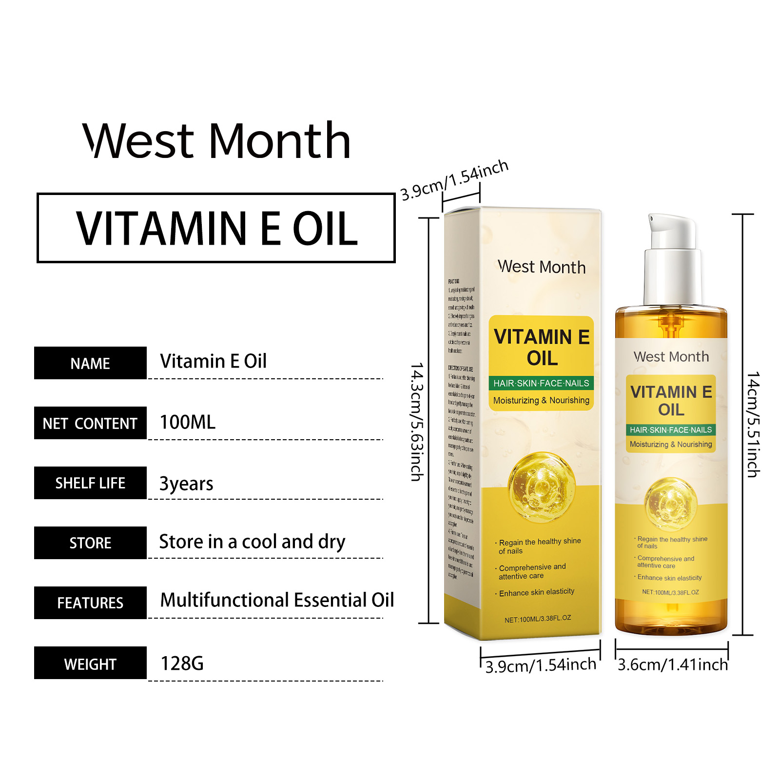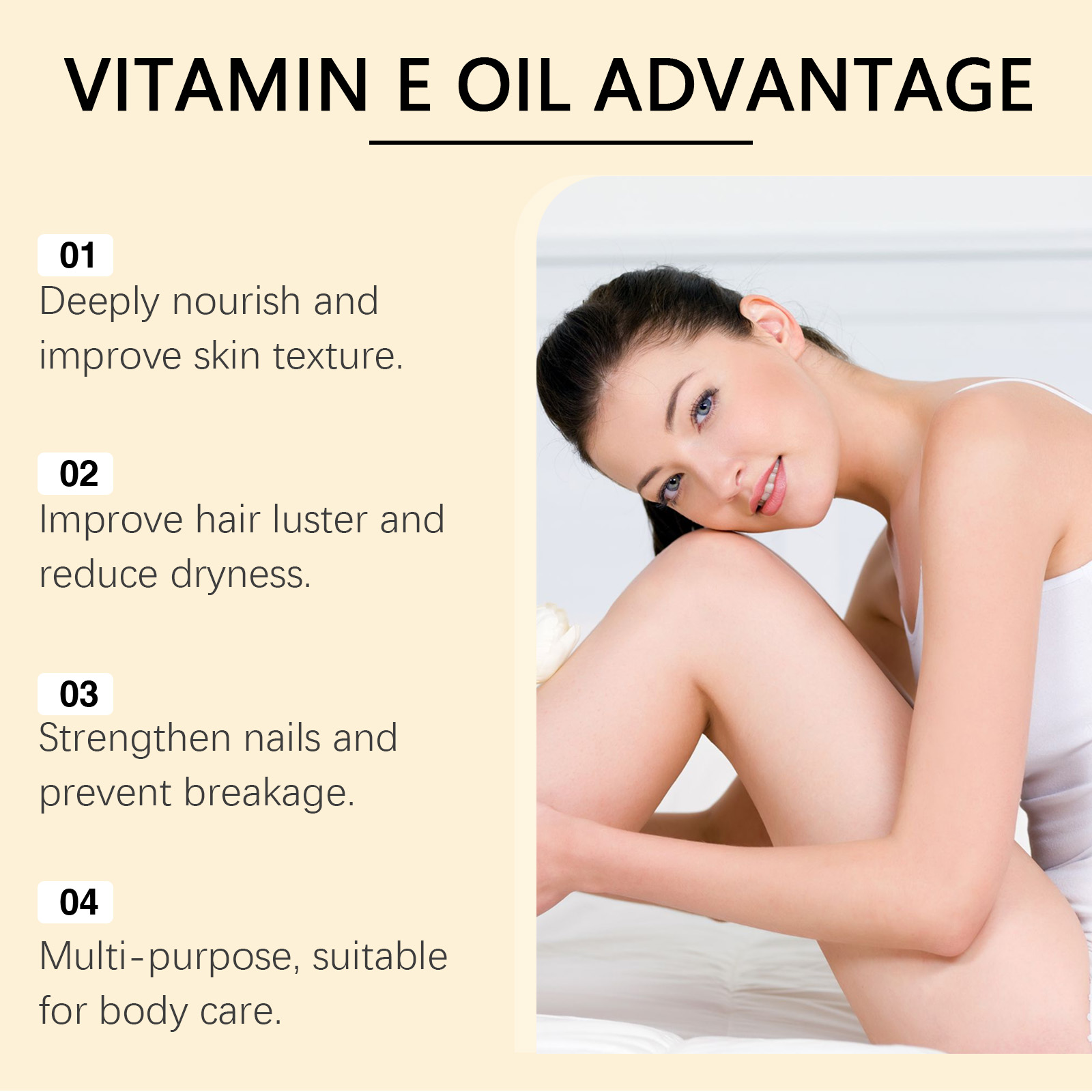 Our Vitamin E body oil contains sodium hyaluronate, lemon extract. It deeply nourishes the skin and retains moisture. Its use is very simple: for facial use: After cleansing, take 1-2 drops of essential oil on the palm of your hand and gently massage the facial skin to promote absorption. For body use: After bathing, apply an appropriate amount of essential oil to the body and massage gently to help relieve pressure for hair: After washing your hair, keep your hair slightly dry. Take appropriate amount of essential oil from the palm, evenly apply to the hair, gently massage the scalp and hair to promote absorption. For nail use: Apply appropriate amount of essential oil to the nails and the skin around the nails, and gently massage to promote oil absorption. It also keeps skin hydrated and soft.