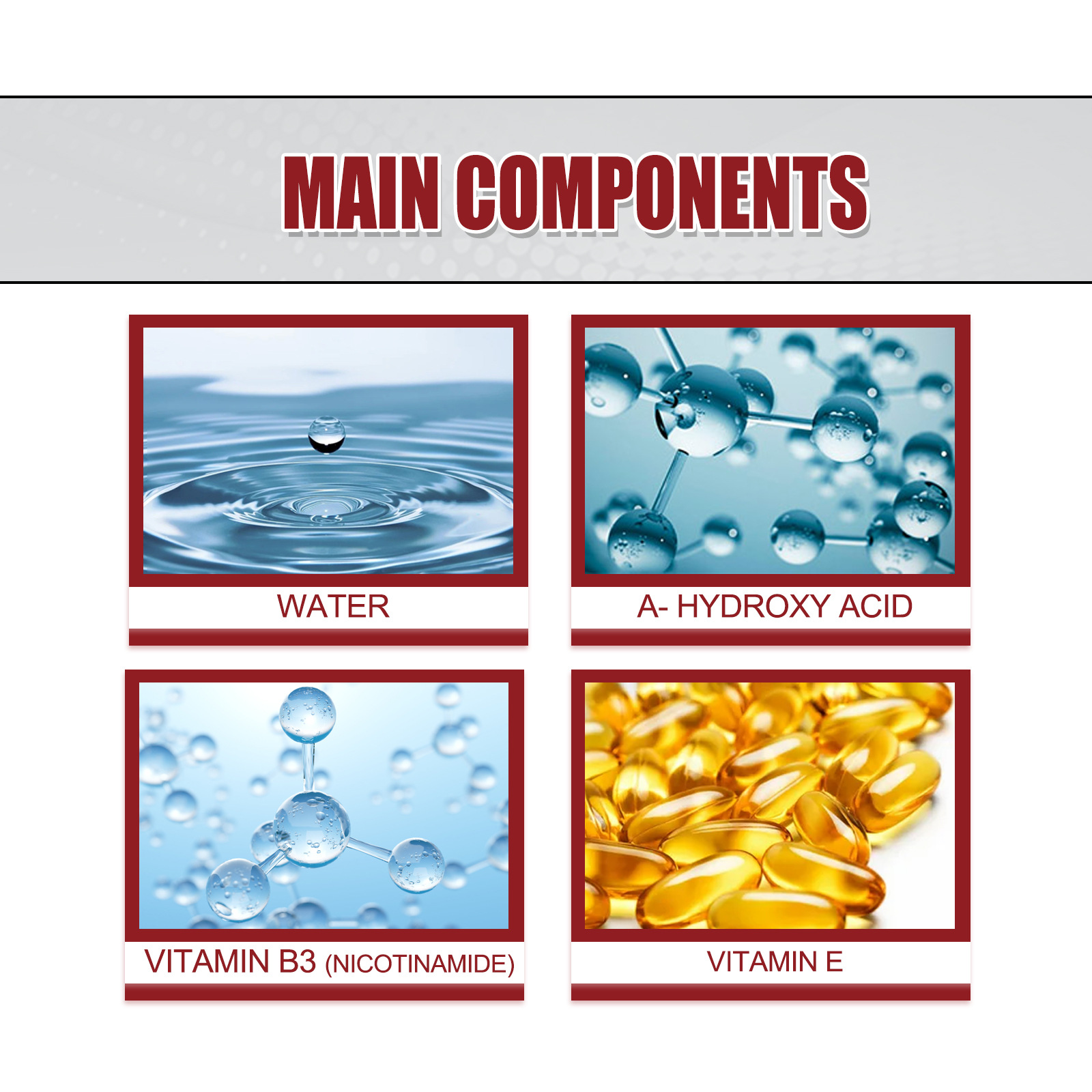 Our Vitamin E serum contains A-hydroxyacid, vitamin B3 nicotinamide, vitamin E. It can help build the skin's water barrier, help skin surface cells renew and regenerate, exfoliate and remove dull skin. Its use method is very simple: after cleansing, take an appropriate amount of this product with a suction cup gently pat until absorbed. You can choose your favorite moisturizer to use every morning or evening. Vitamin E serum improves skin shine, improves wrinkles, and removes dull skin.