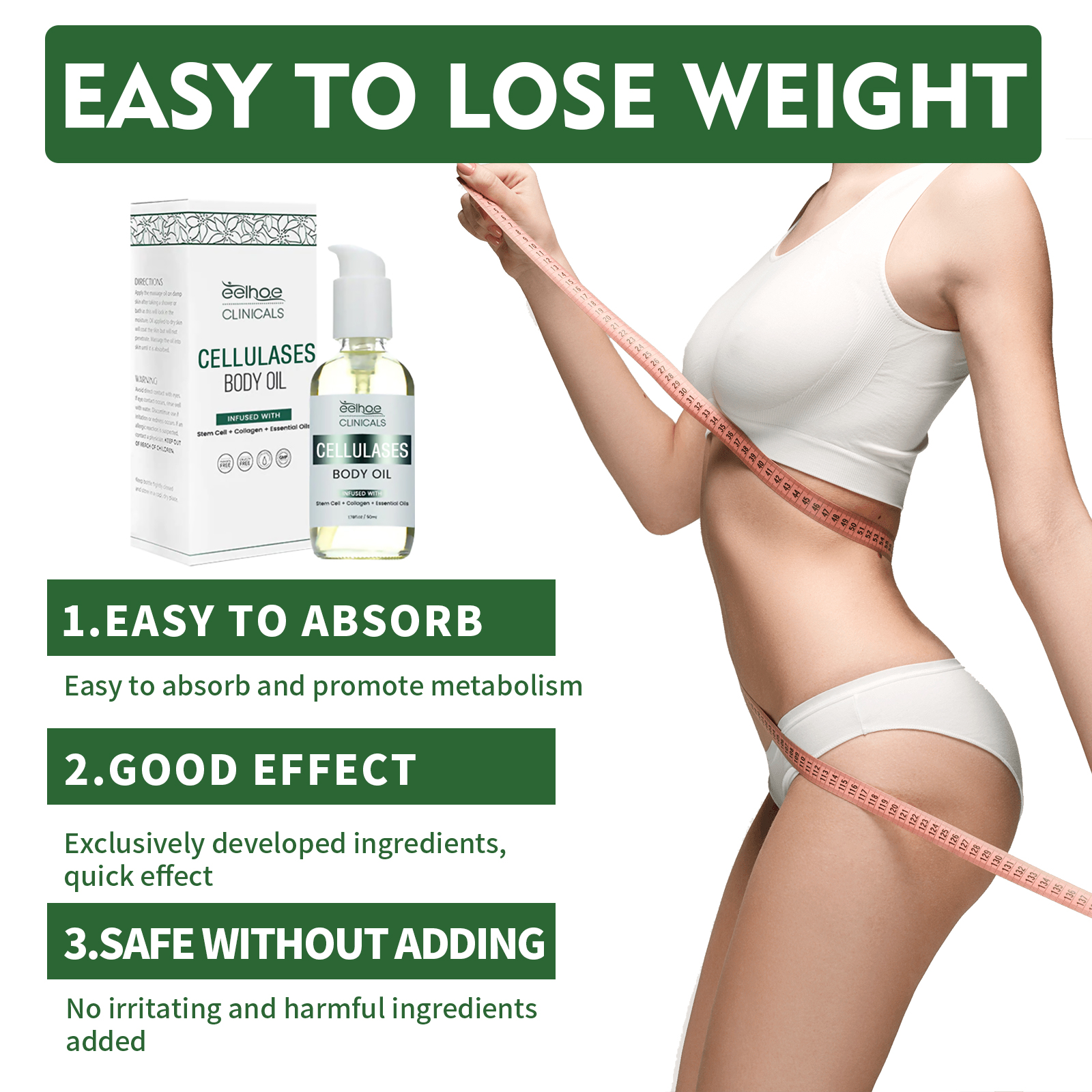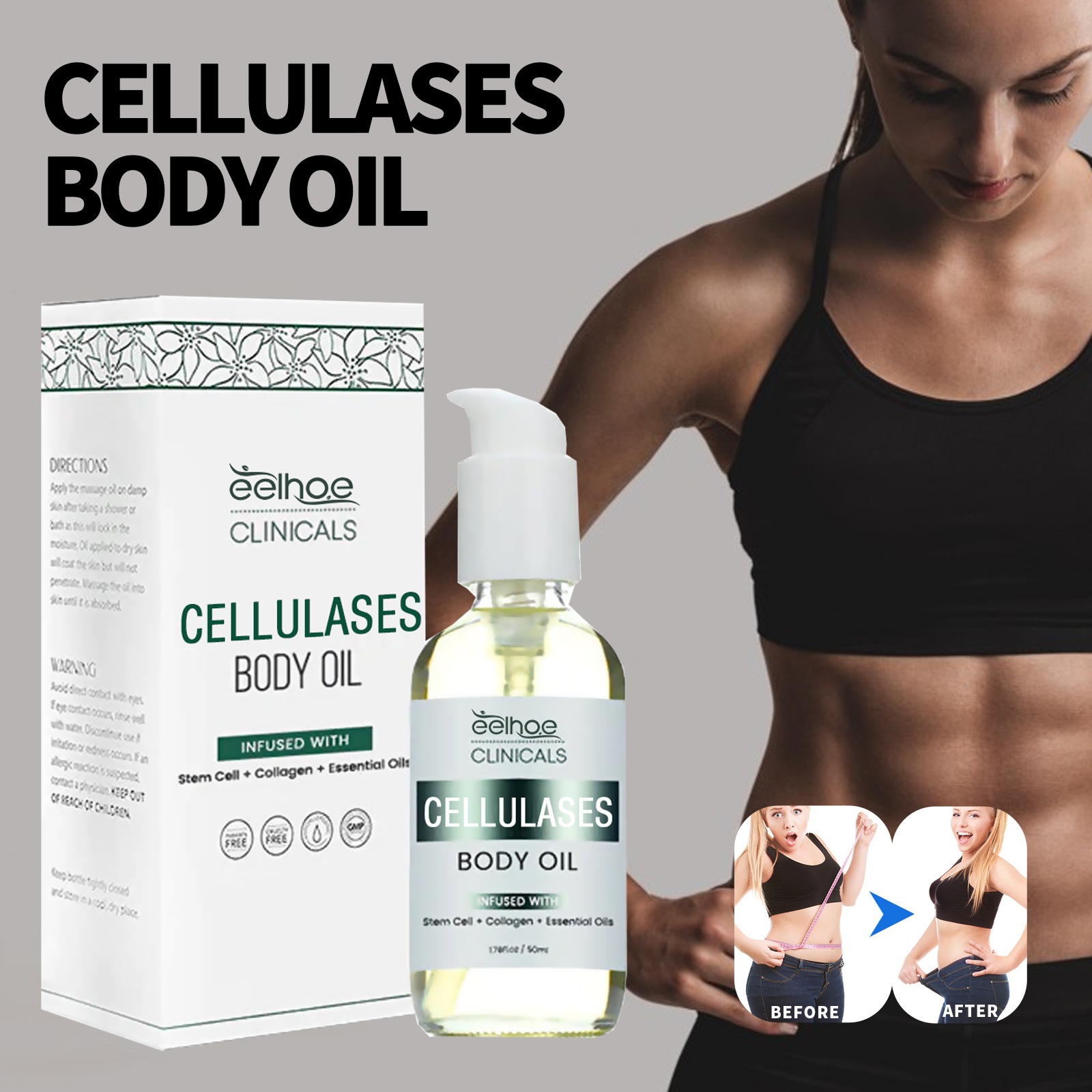 Our cellulose erasing body oil contains collagen, Jojoba oil, ginger root extract. It can reduce cellulite, improve skin softness, increase elasticity, soften and soothe, and tighten skin tone. Its use method is very simple: 1. Drop 2-3 drops of oil on the part to be replaced. 2. Gently massage in circular motions until completely absorbed. 3. For best results, apply twice a day in the morning and before bed. Cellulose wipe body oil deep treatment, direct contact with skin; Easy to absorb, promote metabolism.