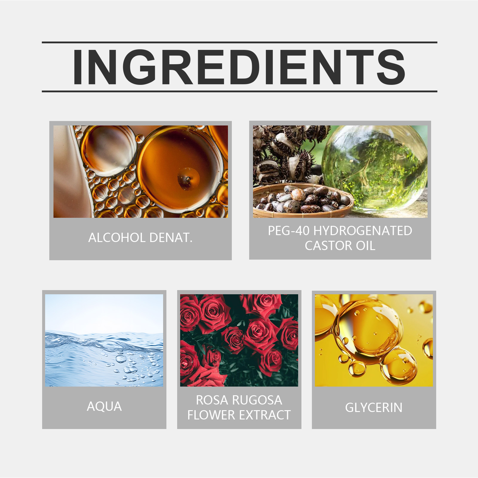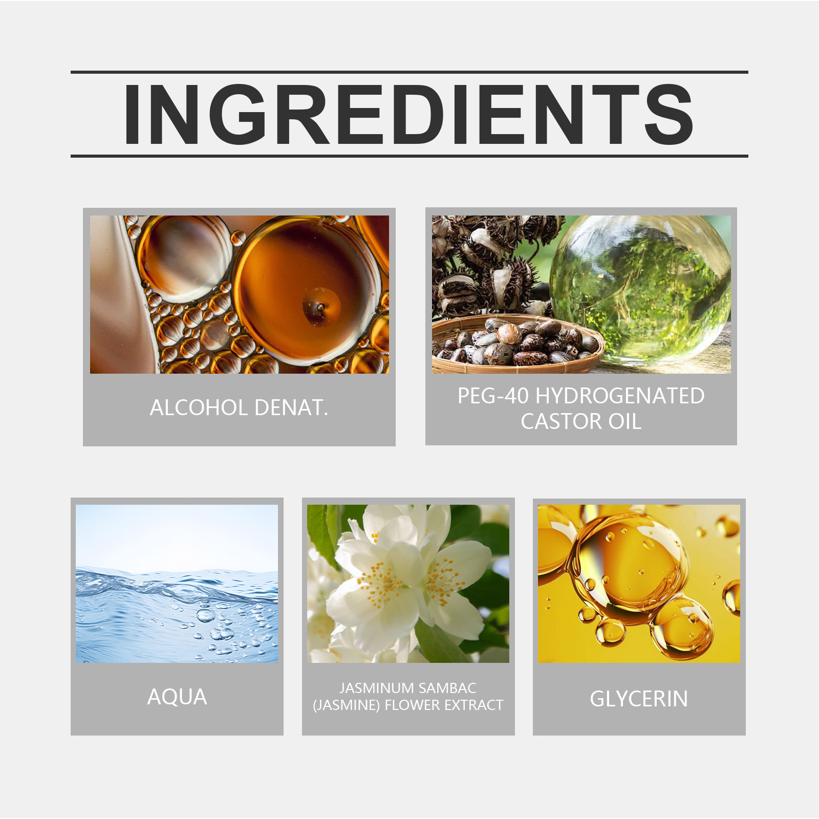 Our eau de parfum contains hibiscus bark extract, rose extract, jasmine flower extract, bergamot fruit extract. It can increase the aroma level and enhance the overall atmosphere. Its use method is very simple: gently spray the perfume on the wrist, neck, chest and other pulse points 1-2 times each spray to achieve the best perfume distribution effect. It can also exude a warm woody aroma and maintain an elegant atmosphere for a long time.