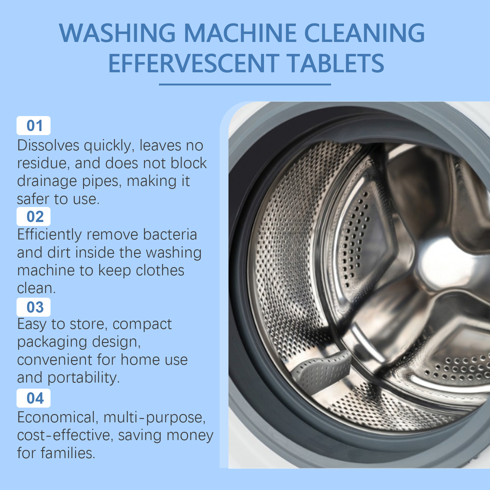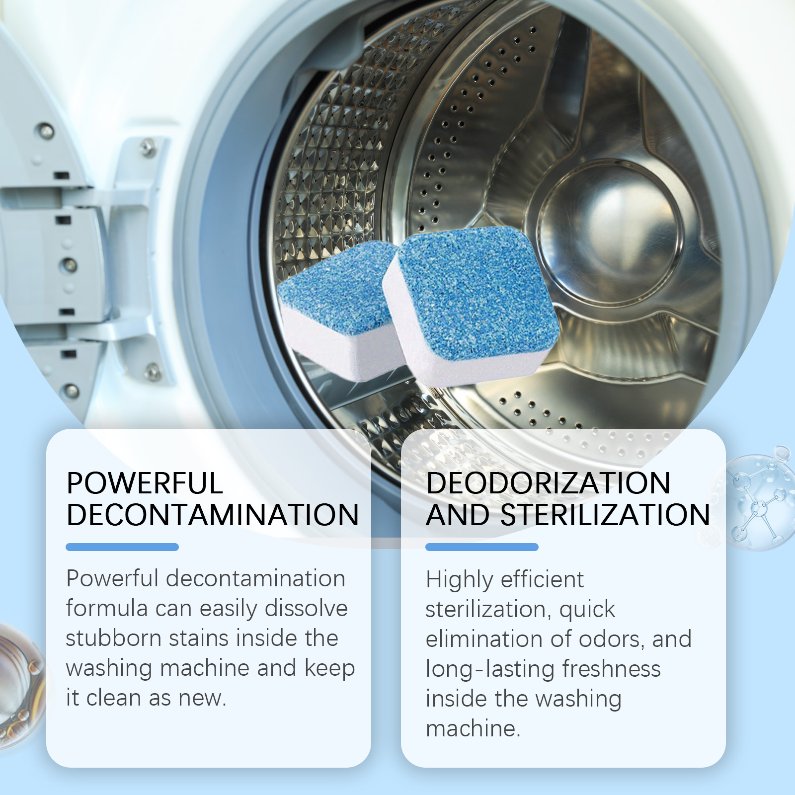 Our washing machine cleaning effervescent tablets contain cocamidopropyl betaine, disodium EDTA and sodium bicarbonate. It can efficiently kill bacteria, quickly remove odors, and keep fresh for a long time. Its use method is very simple: 1. Take 1-2 pieces of this product into the washing machine; 2. Stop water injection after 15 minutes and soak for 3 hours; 3. Finally, open the daily washing mode for cleaning. Powerful decontamination formula, can easily dissolve the dirt in the washing machine, keep the washing machine clean as new.