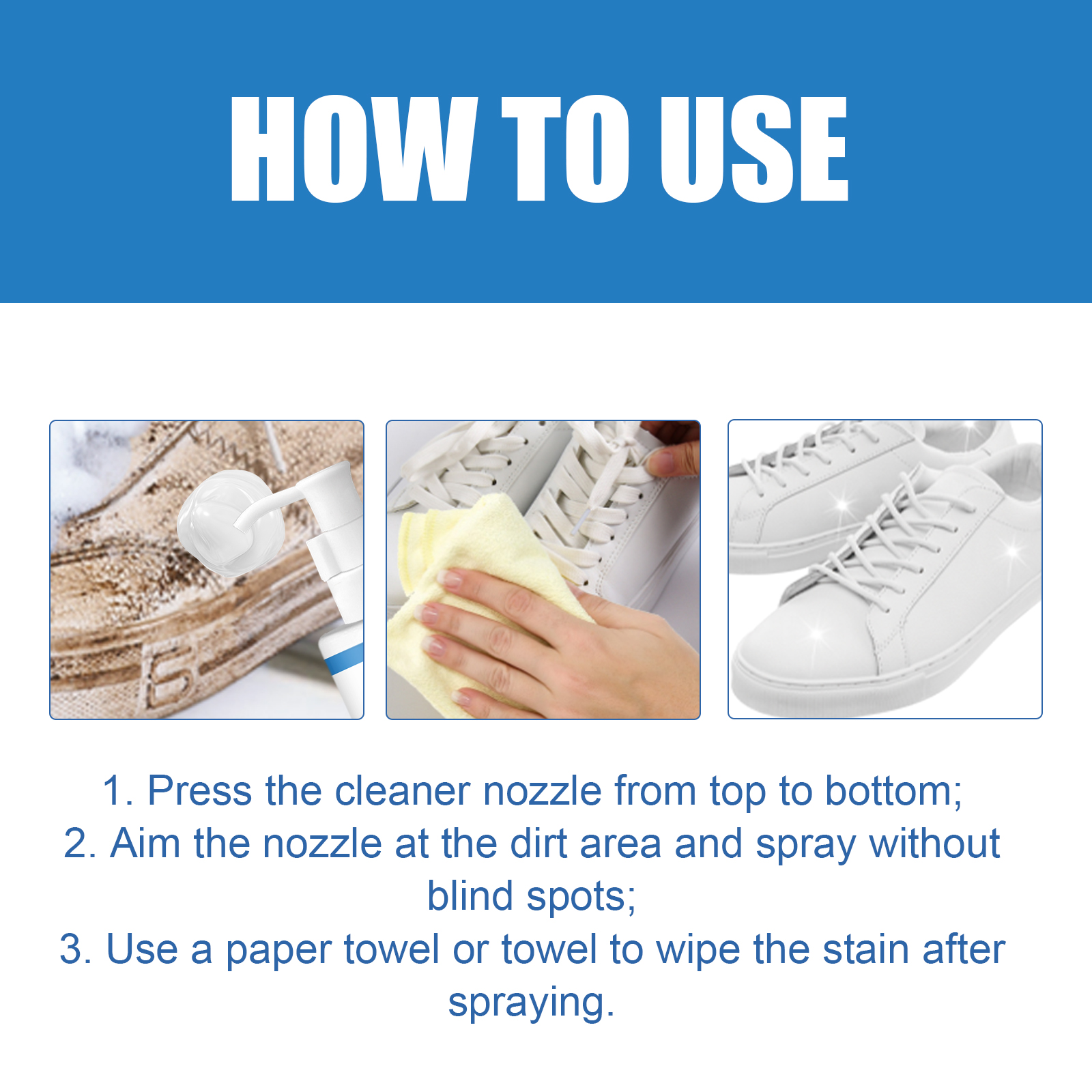 Our White Shoe Cleaner contains surface activators, bioenzymes, and coconut oil. It can deeply dissolve stains, effectively remove stubborn stains on the upper, and make shoes look new. Its use method is very simple: press the nozzle of the cleaner from top to bottom, align the nozzle with the dirty part, spray without dead corners, and wipe the stain with a paper towel or towel after spraying. Efficient cleaning ability, effectively remove all kinds of footwear dirt and stains, leaving shoes looking fresh and clean.