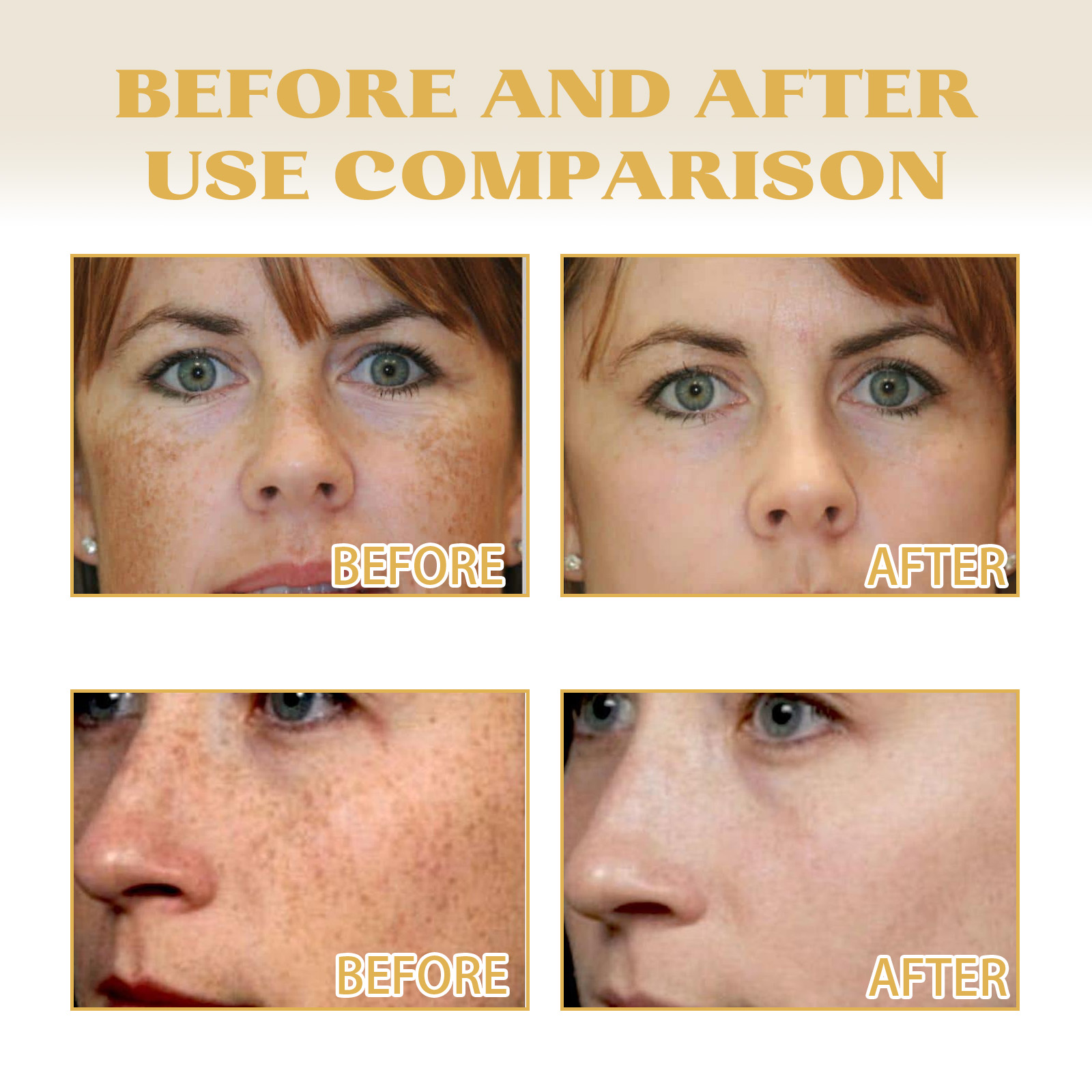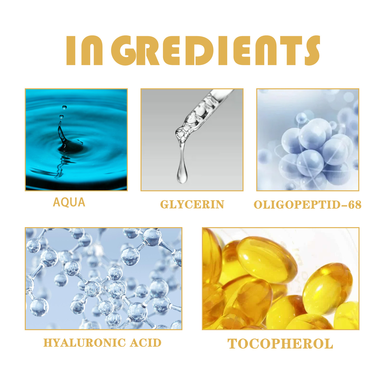 Our whitening serum contains oligopeptide-68, hyaluronic acid, vitamin E. It can reduce dark spots, reduce pigmentation, promote the production of new cells, and make your skin tone glow. The way to use it is simple: clean and dry your face, apply an appropriate amount of serum evenly on your face, and gently massage until absorbed. And can reduce the color spots acne marks.