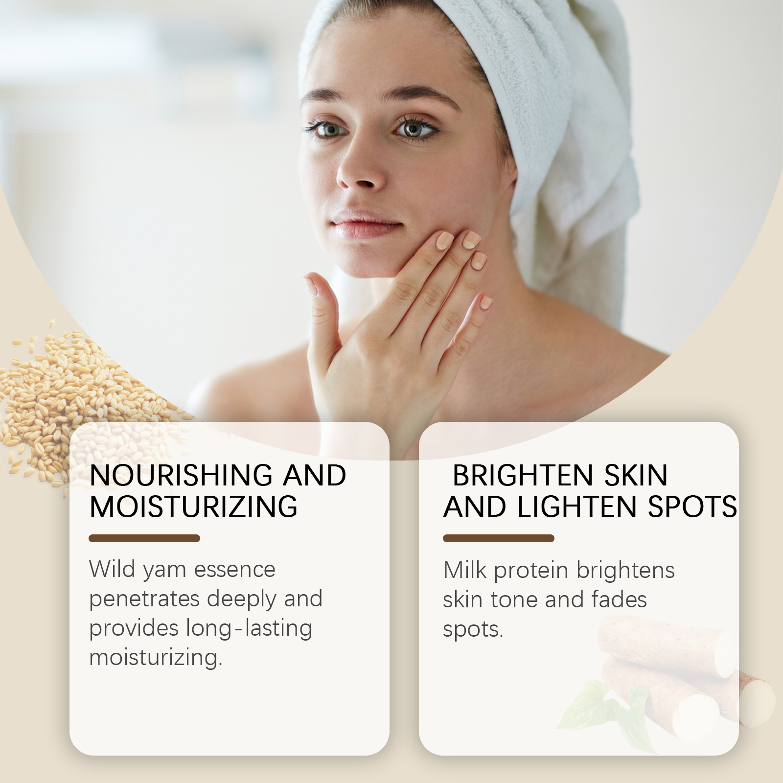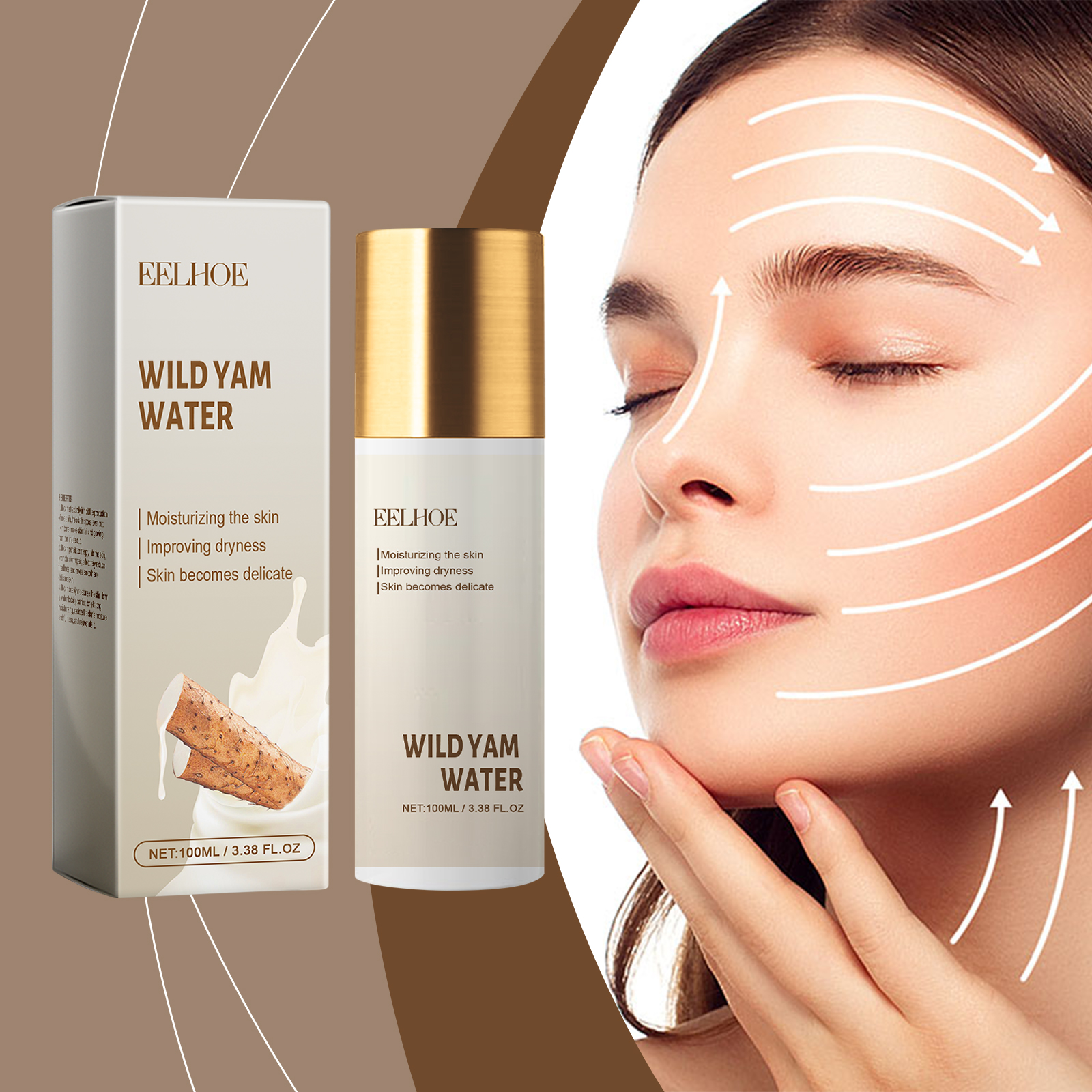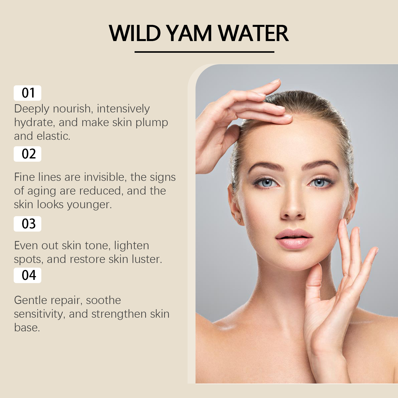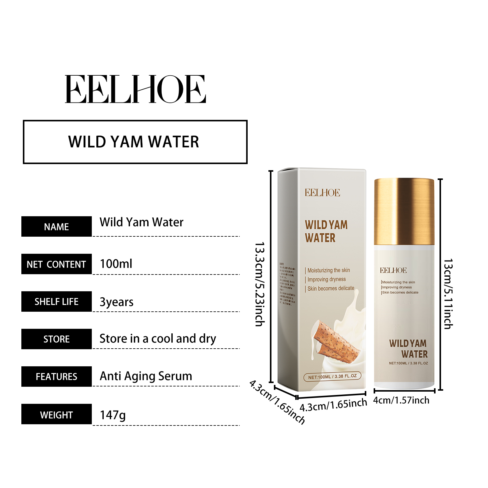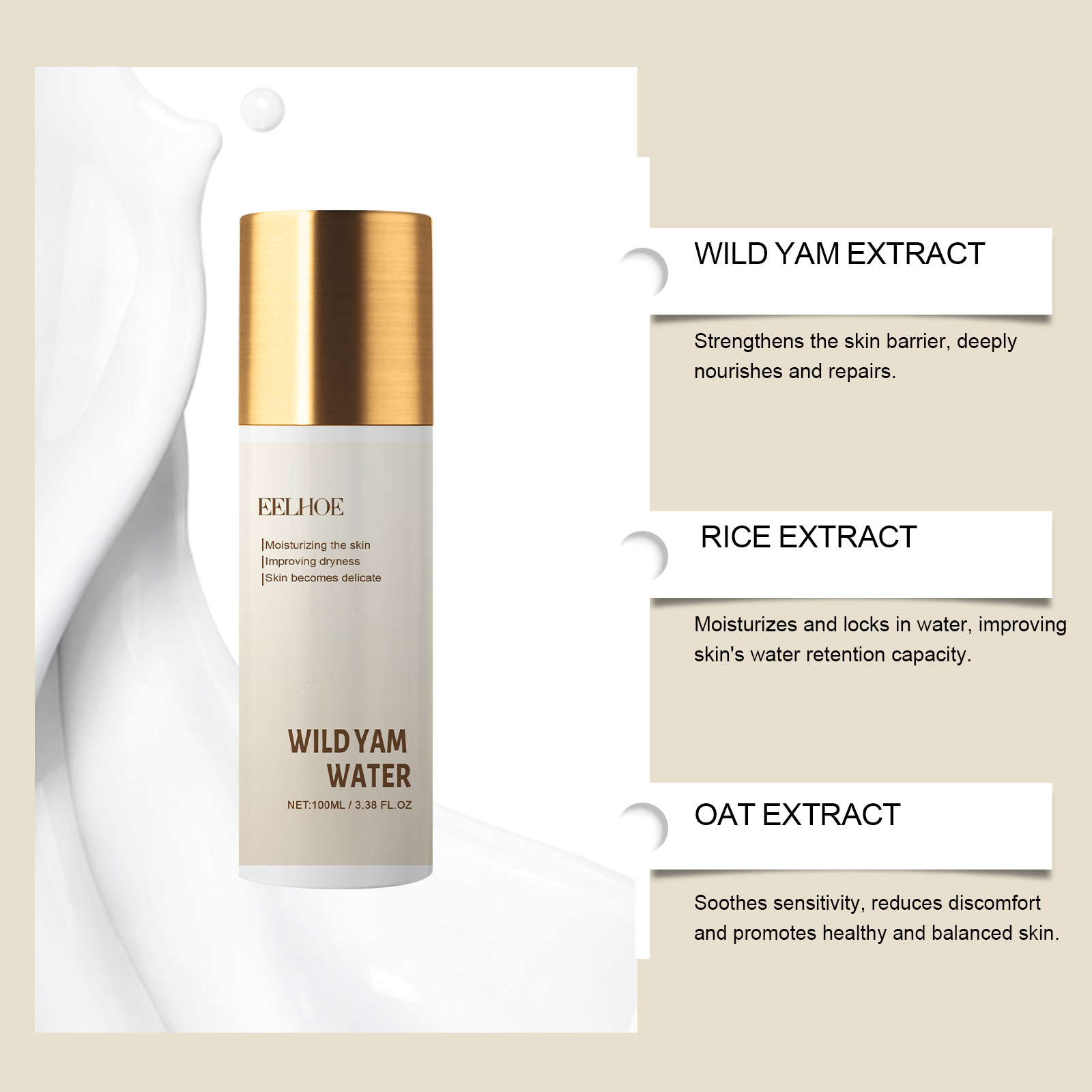 Our Wild Yam Water contains Dioscorea Villosa (Wild Yam) Root Extract, Hydrolyzed Rice Extract, Avena Sativa Kernel Extract. It can deeply nourish, deeply moisturize, make skin full and elastic, even skin tone, fade spots, restore skin luster, gentle repair, relieve sensitivity, strengthen skin base. Its use method is very simple: clean dry facial skin, apply appropriate amount of product evenly on the face, gently pat until absorbed. It can improve the skin, make rough skin delicate, feel velvety smooth, enhance confidence, all-round beauty, exude confidence from the inside out, small and portable, so that you can easily keep your skin in the best condition during travel.