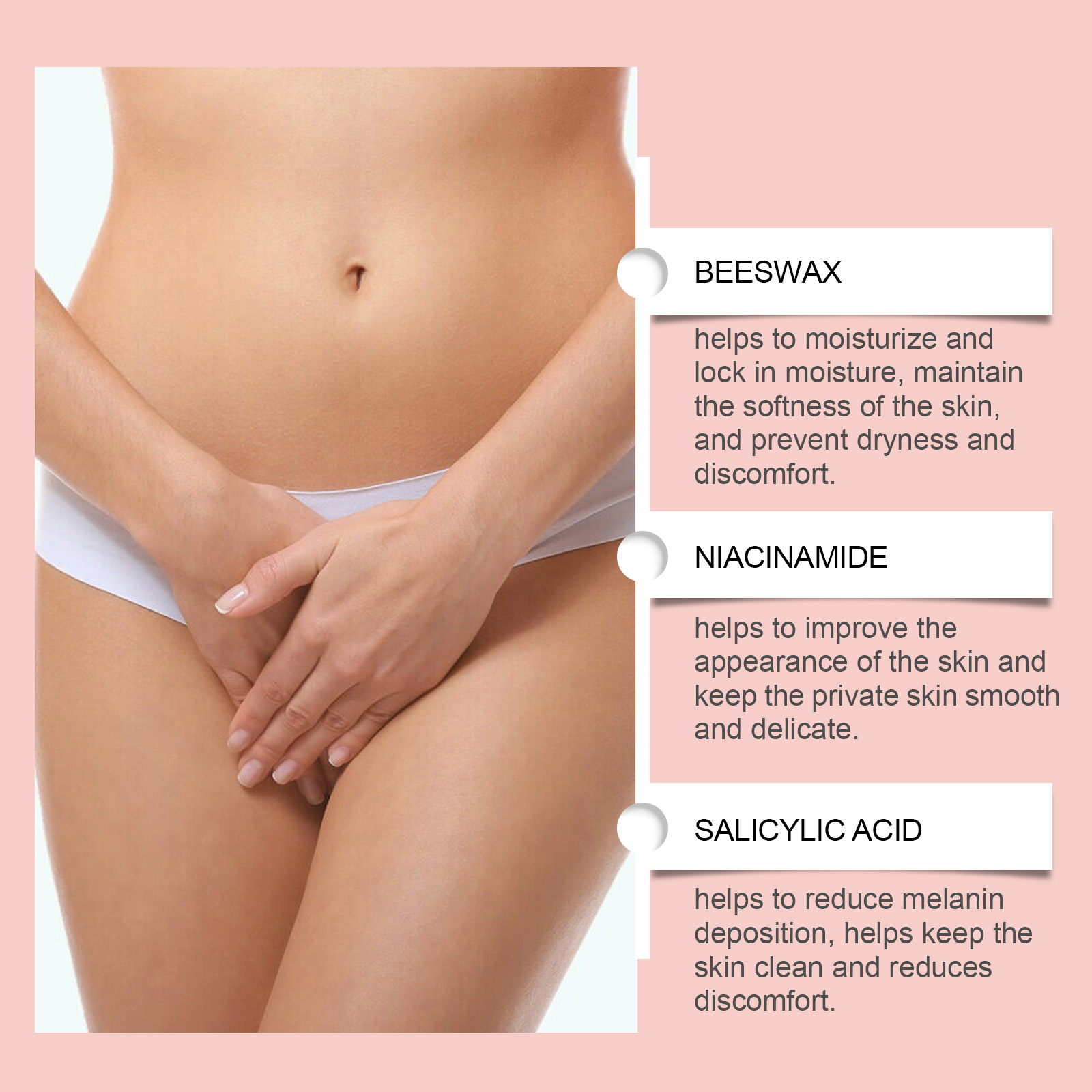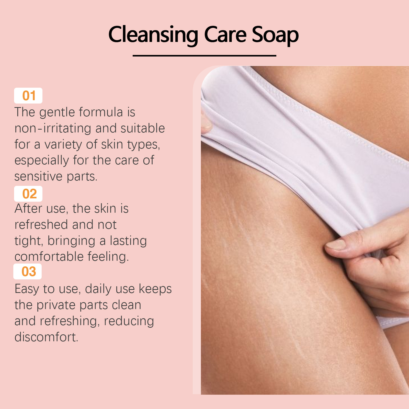 Our cleansing soap contains beeswax, glycerin and nicotinamide. It cleans deep with a delicate foam, easily removes dirt and oil, and keeps private areas fresh. The way to use it is simple: 1. Wet your private parts with warm water. 2. Gently rub several times until rich and delicate foam is produced, then apply to private parts, and finally rinse thoroughly with water. It helps to reduce discomfort caused by external factors and keep private parts clean and comfortable.