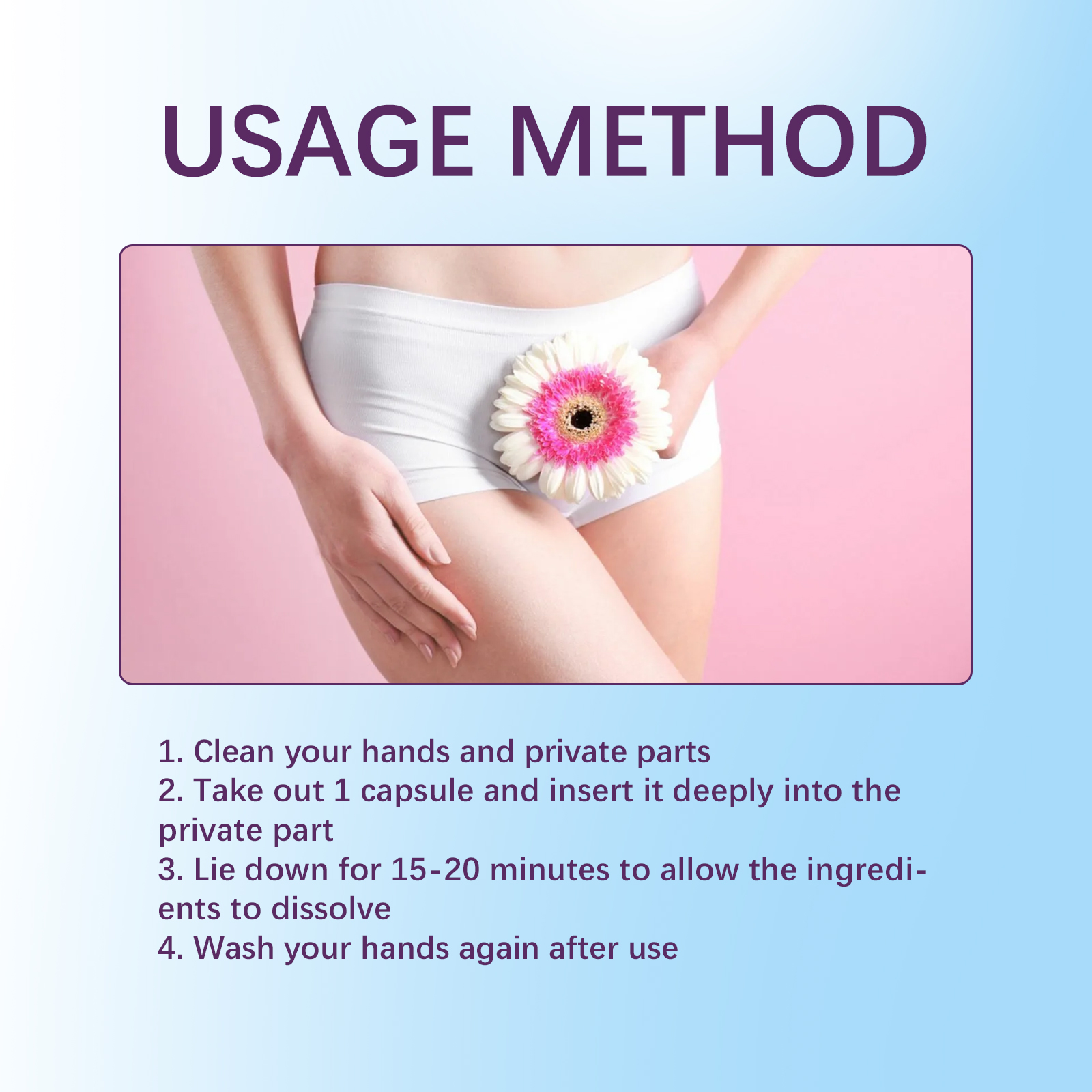 Our women's herbal capsules contain alpine snow lily extract, safflower extract, snake seed extract. It can enhance your intimate health, promote pH balance, sterilization and odor control; Enhancing resilience and protection, creating an internal barrier to intimate forces; Makes you slimmer, detoxifies and reduces swelling. Its use method is very simple: 1. Clean hands and private parts; 2. Take out 1 capsule and insert it deeply into the private part; 3. Let the ingredients dissolve for 15-20 minutes. 4. Wash your hands again after use. Feminine care herbal capsules fight bacteria and yeast while rejuvenating private areas.