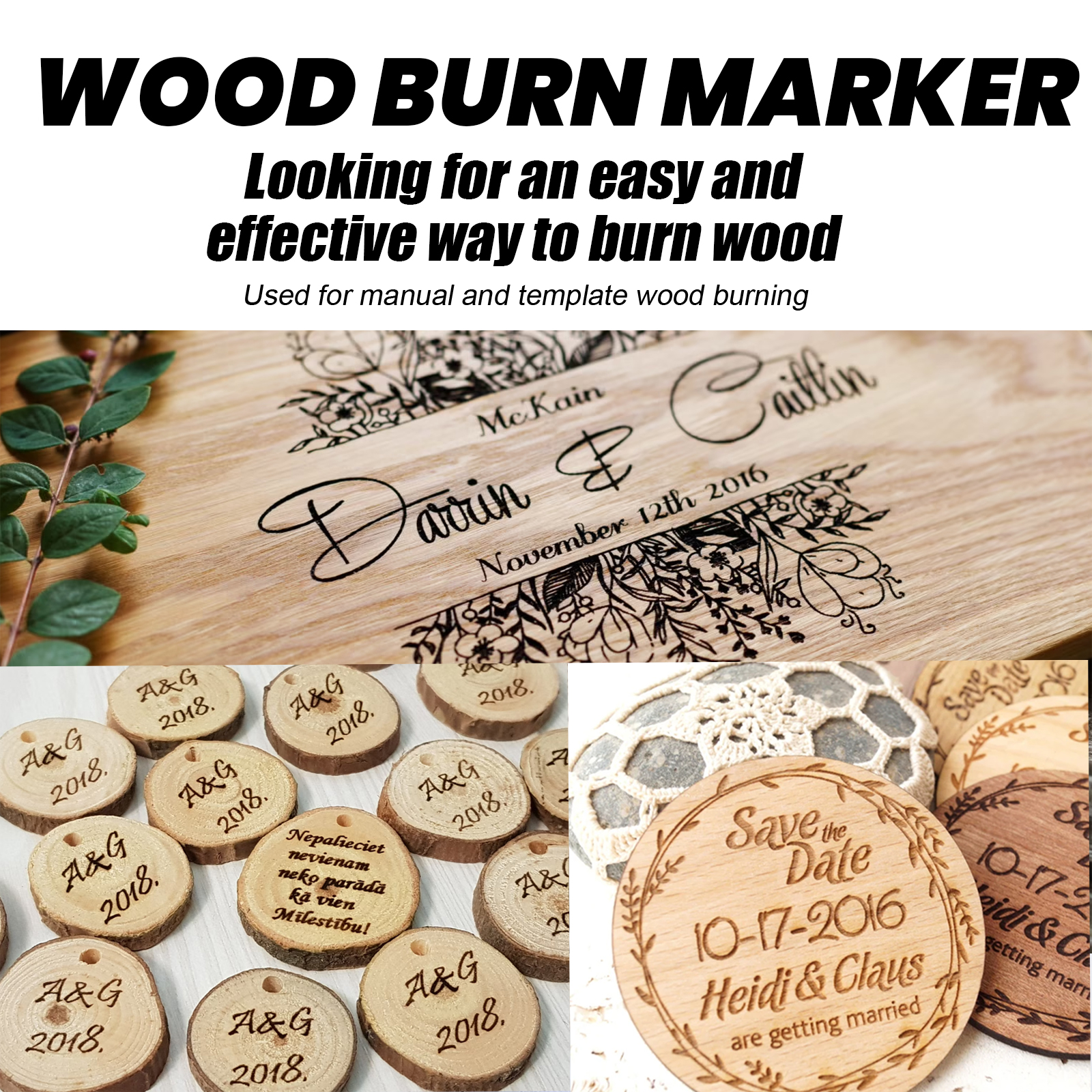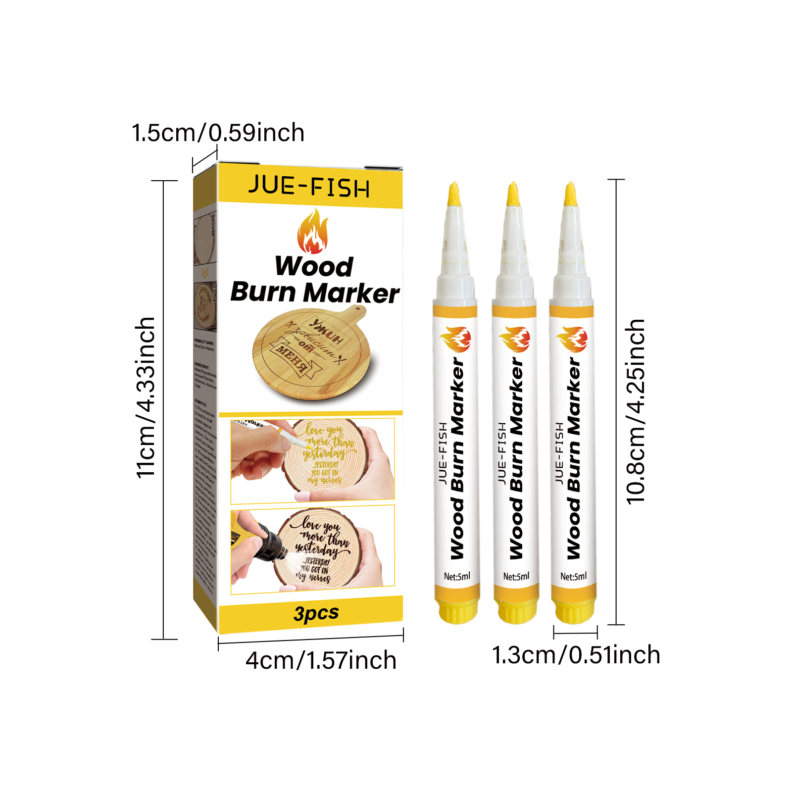 Our wood burning markers contain polyurethane and acrylic polymers. It can be used for small wooden signs or intricate detailed patterns to record your design on the wood surface. Its use method is very simple: smooth the surface of the wood with sandpaper, shake the product before use, adjust the moisture on the paper, use the product to draw a pattern on the surface of the wood, and heat the pattern with an electric heater to show burn marks. And you can make marks on wood.