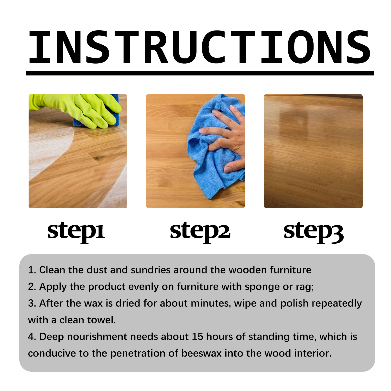 Our wood floor care wax contains propolis, starch and microcrystalline stone. It can clean the floor. Its use method is very simple: 1. Clean up the dust and debris around the wooden furniture. 2. Apply the product evenly on the furniture with a sponge or rag; 3. Deep nourishment requires about 15 hours of standing time, which helps the beeswax penetrate into the interior of the wood. And it can make the wooden floor more shiny.