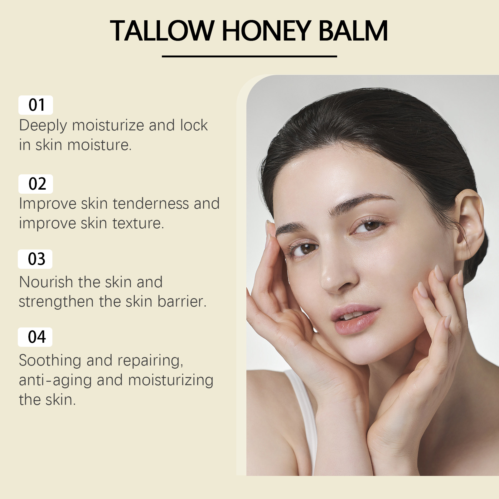 Our tallow Honey facial moisturizer contains tallow, honey extract, glycerin. It's a powerful moisturizer that locks in moisture and keeps skin hydrated and smooth. Its application method is simple: 1. Clean facial skin and keep it dry. 2. Apply appropriate amount to face. 3. Gently massage until absorbed. Rich in nutrition, improve skin texture, make skin soft and delicate.