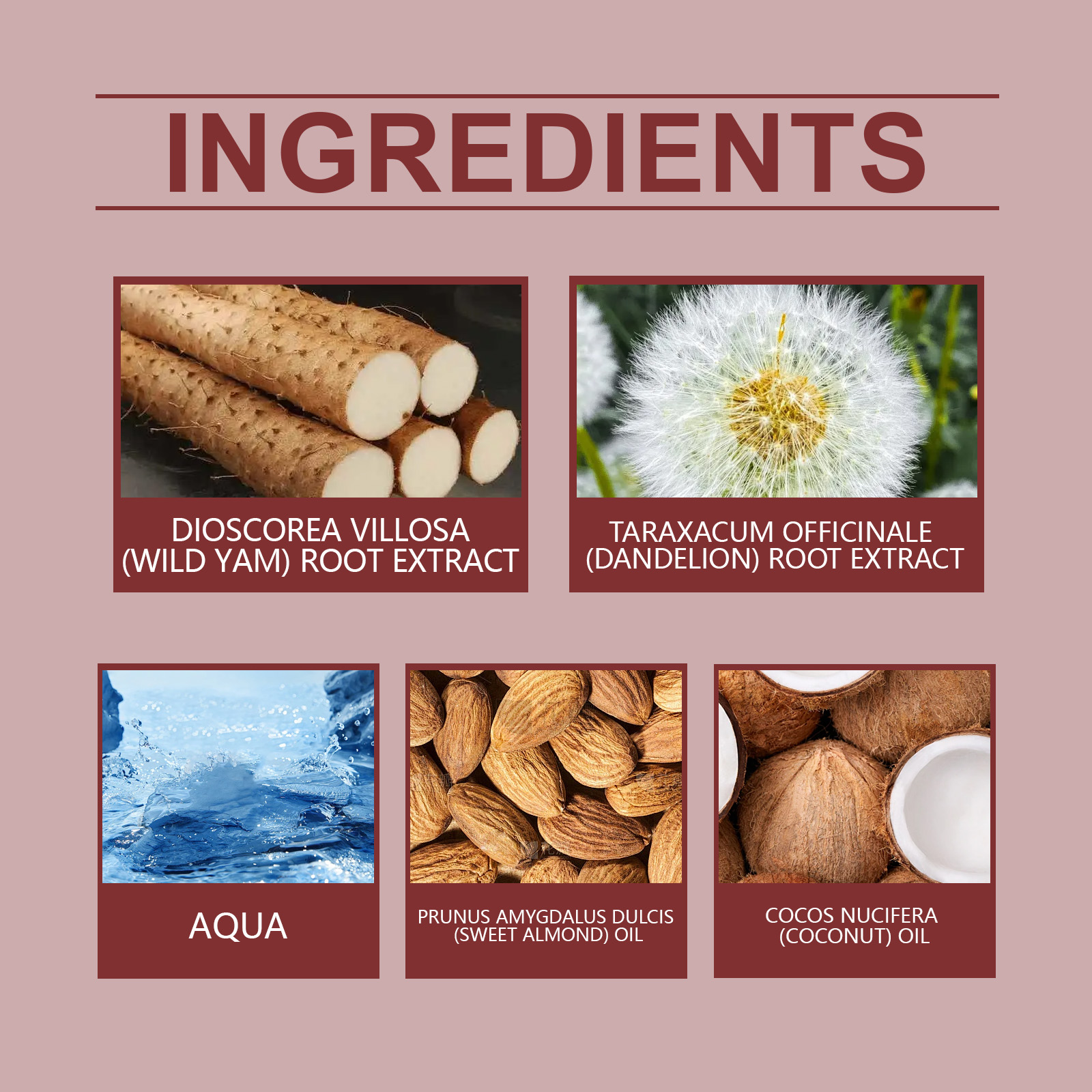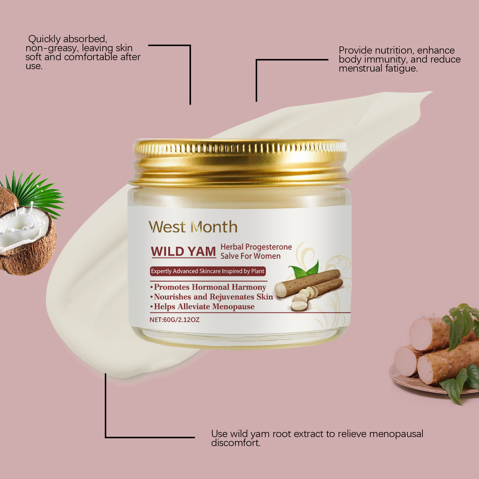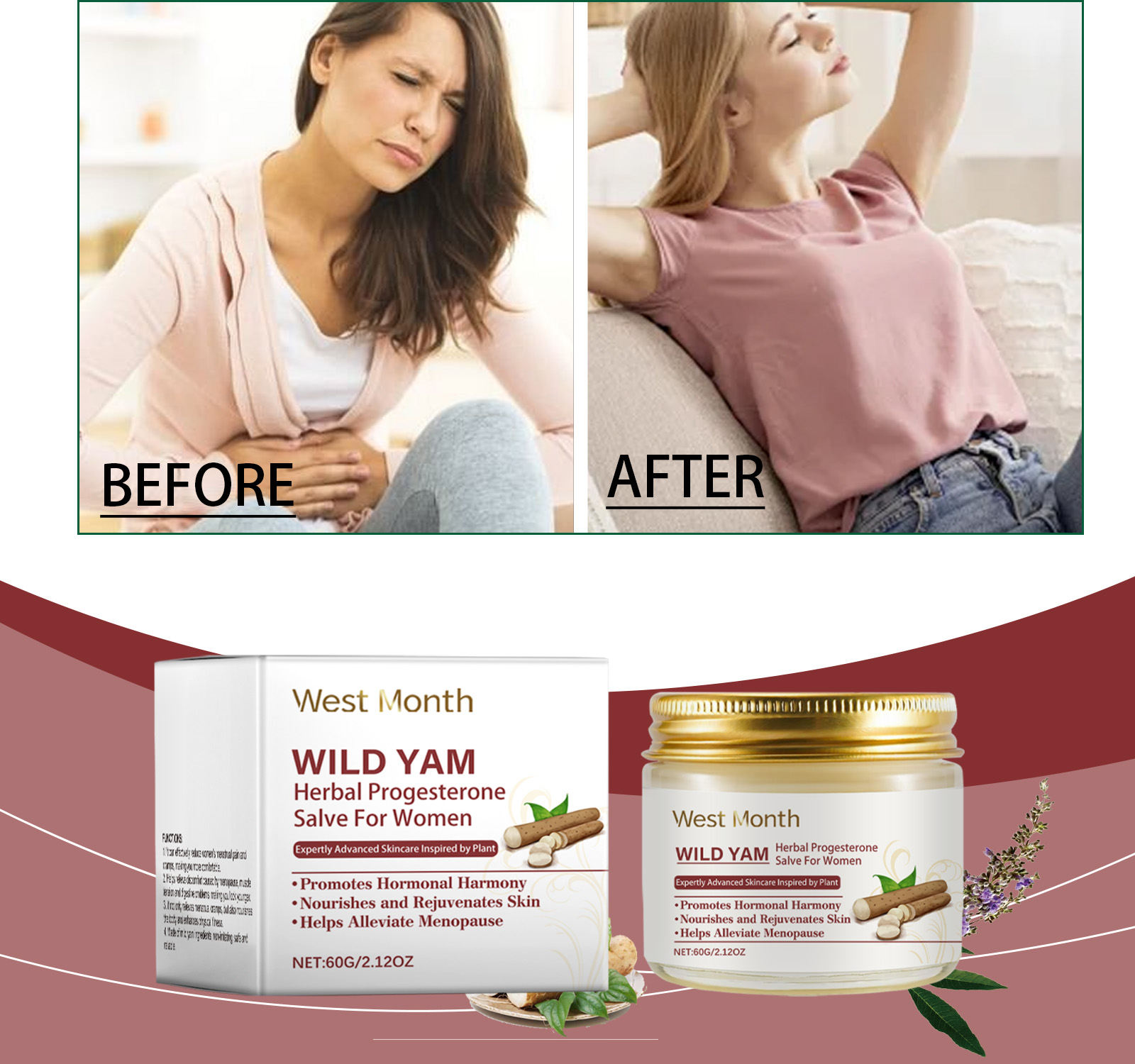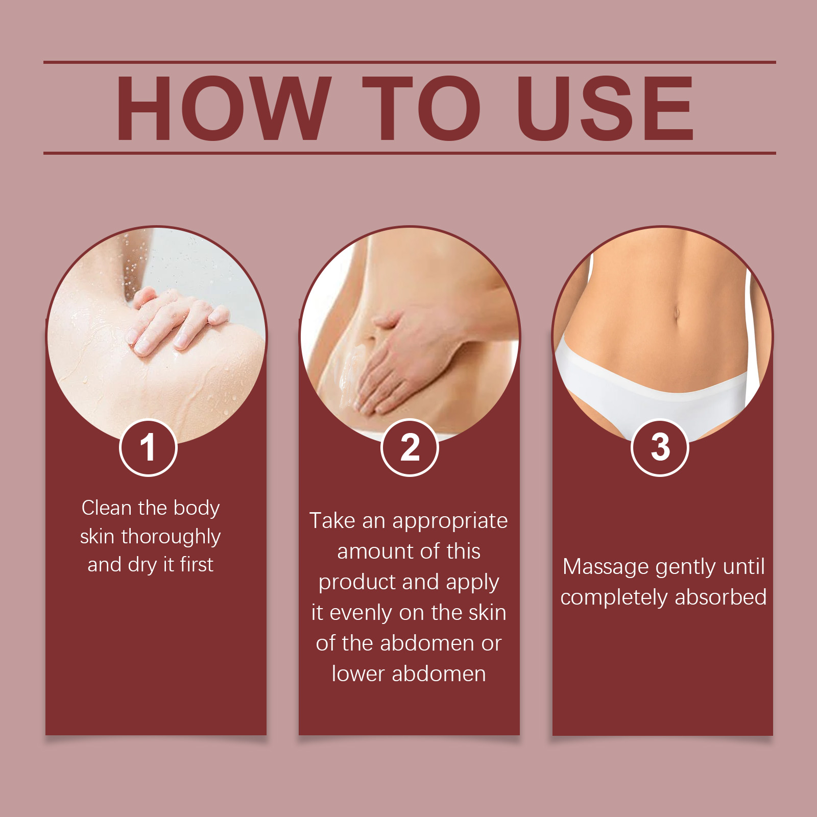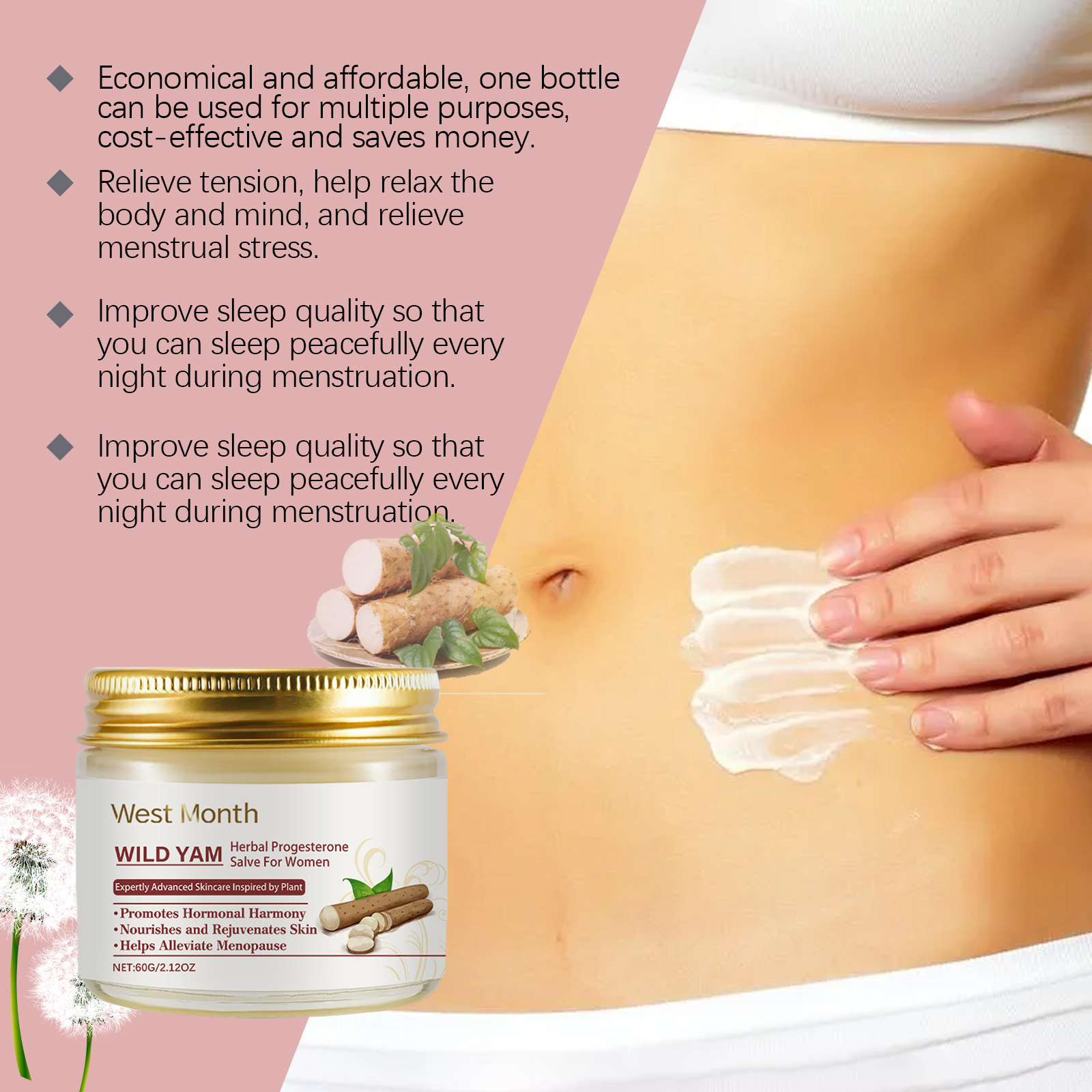 Our ointment contains wild yam root extract and dandelion root extract. It can cause muscle tension and digestive problems, making you look younger. Its application method is very simple: thoroughly clean the body skin, and dry it first, apply appropriate amount of this product evenly on the abdomen or lower abdomen skin, gently massage until completely absorbed. And it can promote blood circulation, help relieve colds during menstruation, and keep the body warm.